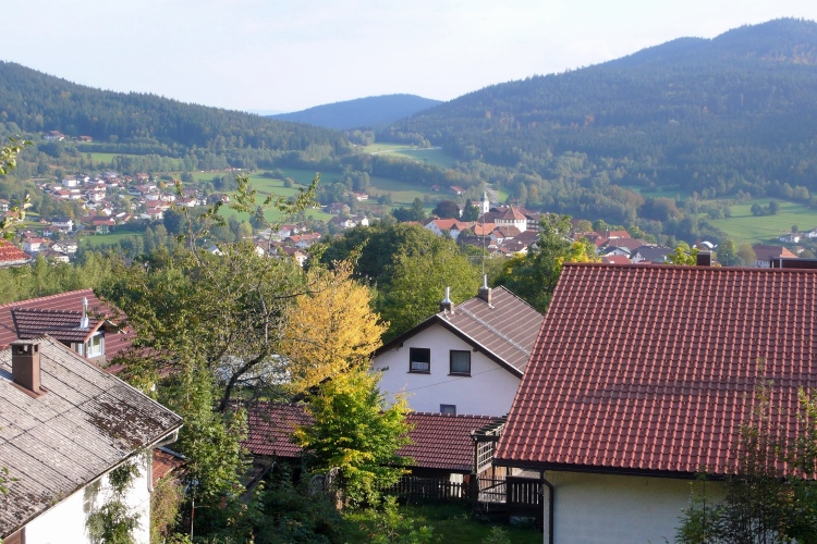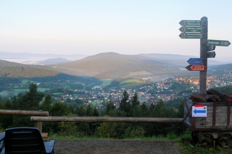 Der bunte Lindwurm flitzt los. Nur ein Bild geschossen, und ich bin wieder ganz hinten. So ist das eben, man muss Opfer bringen, damit ihr gut informiert werdet. Entlang der Hauptstraße durch Bodenmais, sanft abwärts. Dann geht‘s aufi zum Silberberg. Der heißt so, weil da mal Silber drin war. Der Barbarastollen kann besichtigt werden (klar- erst hinterher), ist mit der Seilbahn erreichbar - gut für die Waden. Und wer sich umdreht, hat einen tollen Blick auf den Ort.