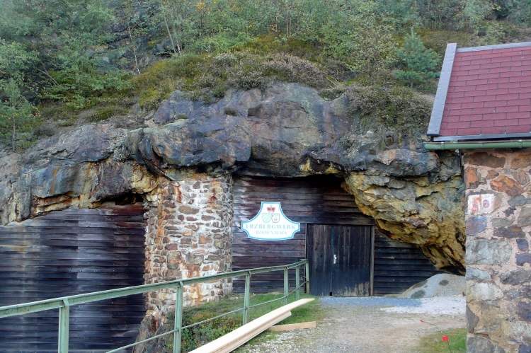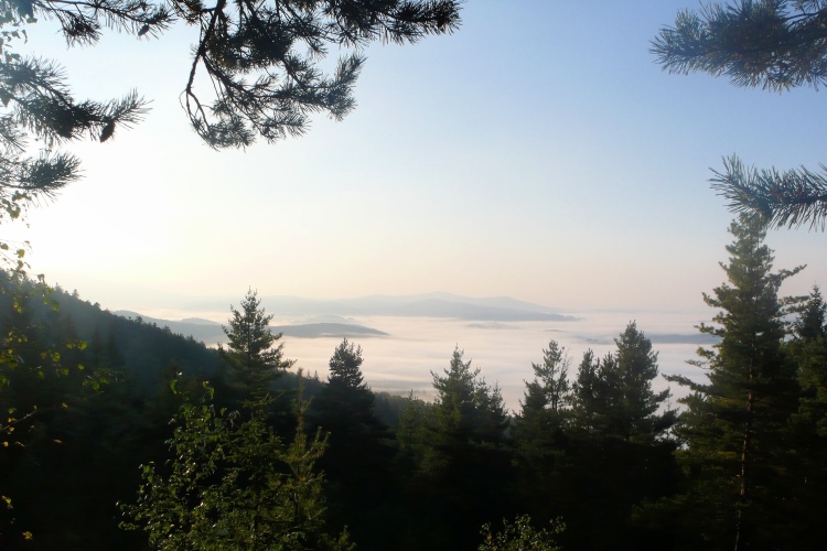 Statt Drahtseil haben wir den Trail benutzt. Einen richtig schönen, technisch nicht schwierig, viel weicher Boden, auch Schotter dazwischen. Am Stolleneingang vorbei geht es auf die andere Bergseite. Eine Höhle mit Fackeln, da müssen wir durch. Toll, aber dann kommt eine Aussicht, einfach grandios. Der Frühnebel deckt das Tal zu, darüber die Sonne - ein Traum. So macht‘s richtig Spaß. Noch eben über den Gipfel - ja, wir lassen keinen aus, es geht heut immer über die Gipfel- und dann schön bergrunter auf richtig schnellem Trail und immer im Wald. Hochgefühl breitet sich aus.