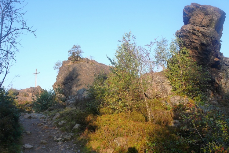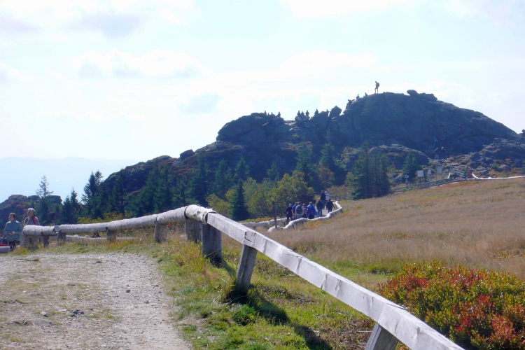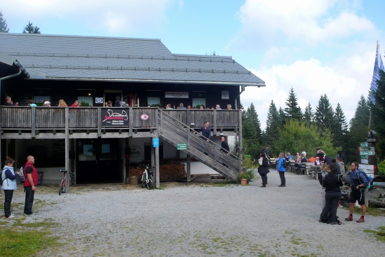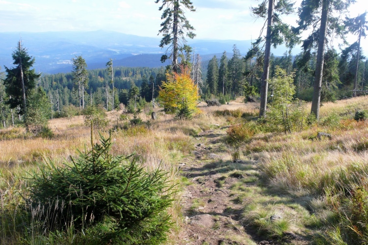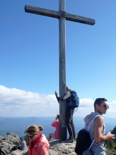 Umdrehen nicht vergessen - wegen der Aussicht! Auf einem Felsblock steht das Gipfelkreuz, ausgepumpte Wanderer liegen herum, ziehen die Beine ein, als wir drüber weghüpfen. Deja vu, aber noch imposanter: der Große Arber mit den Radomen und einem verflixt tiefen Tal davor. Etwa da runter ? Na gut, die Serpentinen sind steil, an der Chamer Hütte gibt‘s zu Mittag, es duftet. Ist es denn schon so spät? Wie die Zeit verfliegt, das merkt man gar nicht. Eine Uhr trage ich nämlich nicht - das gibt nämlich immer so kribbelnde Überraschungen, wenn ich mal nach der Zeit frage...