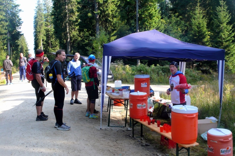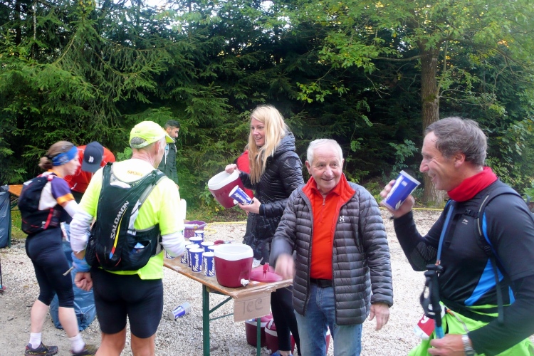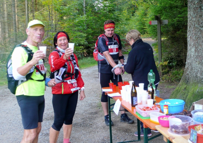 Egal, Distanz hilft, also weiter und hoch. Der Gipfel ruft und alle hören es deutlich. Der Trail wird nun anspruchsvoller. Laufen wird schwierig, gehen klappt gut. Mal dichter Wald um uns herum, mal offene, breite Wege. Plötzlich wird‘s flacher, ein Gipfelkreuz links, dann gleich wieder runter. Moment mal, hier waren wir eben schon mal, eine Schleife schließt sich. Der erste VP mit Vollversorgung kommt. Etwa 14 km sind geschafft.
