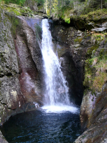 Ich hab‘s noch im Ohr: die letzten 10 km geht‘s nur bergab. Stimmt, netto. Praktisch ist da aber noch was anderes im Weg. Erst sanft, dann steil bergab - das lässt sich gut an. Ein Aussichtspunkt mit Blick auf Bodenmais. Man hört bereits die Ansagen! Aber nach einer Kehre - übrigens, Orga: gebt doch den jungen Helfern Schlafsäcke und Decken mit - steigt der Weg an. Der letzte Getränkestand, etwas vorverlegt, dann wieder ein feiner Trail zu den Rieslochfällen. In Kaskaden stürzt der Bach zu Tal, ich möchte da auch hin. Aber nein, zwischen den Klippen schrauben wir uns wieder in die Höhe.