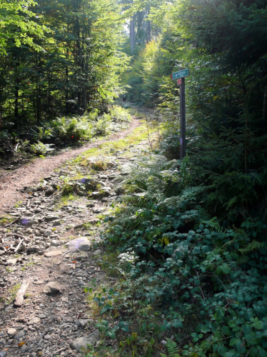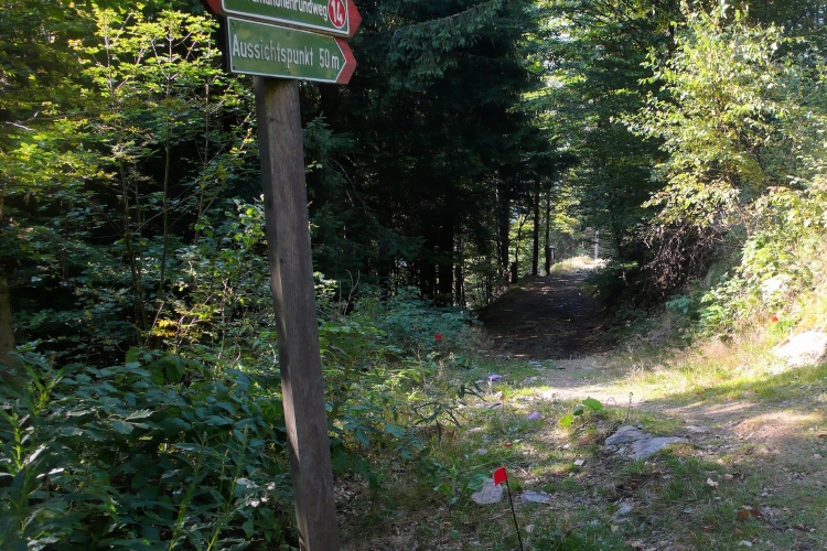Nix da, das Ziel ruft und da der Weg bekanntlich das Ziel ist, weiter. Loses Geröll - das könnte der Förster ja mal beiseite fegen - macht es abwärts nicht wirklich einfacher. Auf Schotter wieder hoch zum Auerhahn. Ein Doppel- VP ist das. Hin waren wir schon hier und jetzt wieder.
