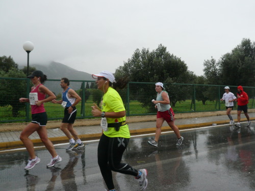 Endlich, es geht auch einmal abwärts. Auf dem Gefälle Richtung Rafina (km 18) kann man es einmal so richtig rollen lassen. Aber der nächste Anstieg wartet schon. Meine Zeit für die Halbdistanz verschweige ich, beim Jungfrau Marathon war ich schneller. Aber der Regen hat aufgehört.