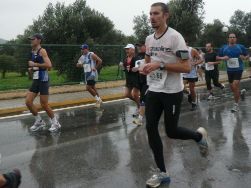 Während unter dem Startbogen die Teilnehmer den feierlichen Eid sprechen, hechten die Letzten über die Bande in ihren Block und sind schon vor dem Start außer Atem. Zuschauer sind kaum anwesend. Den Einheimischen ist es wohl zu nass und für die Angehörigen ist es ziemlich umständlich, wieder zurück in Richtung Athen zu kommen. So bejubeln die Marathonis sich einfach selbst, als endlich der Startschuss fällt.