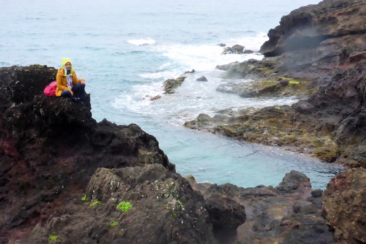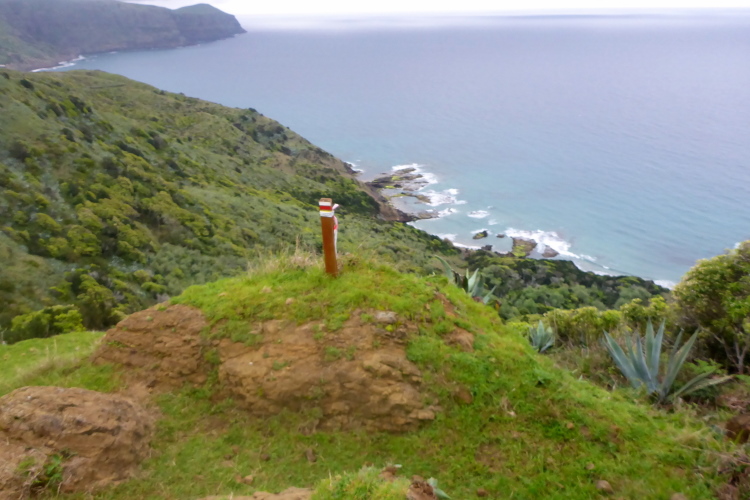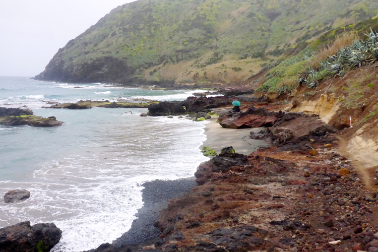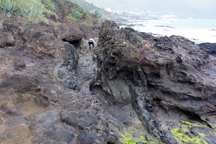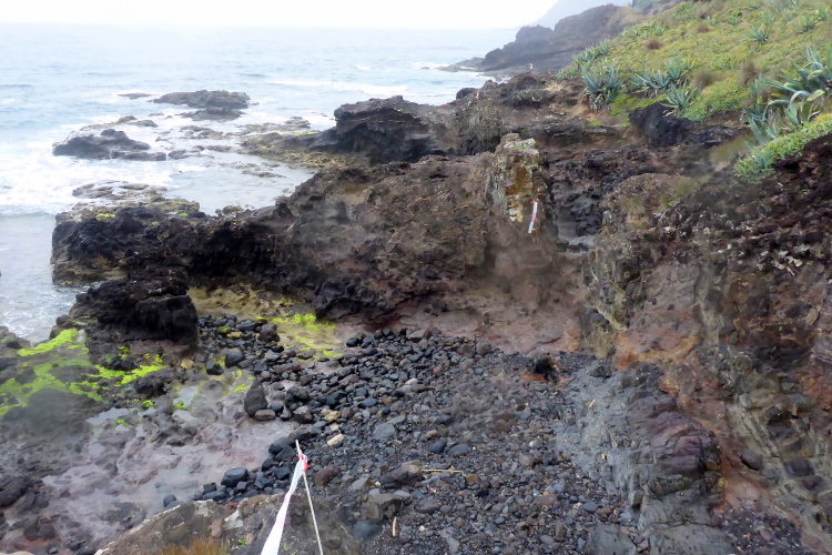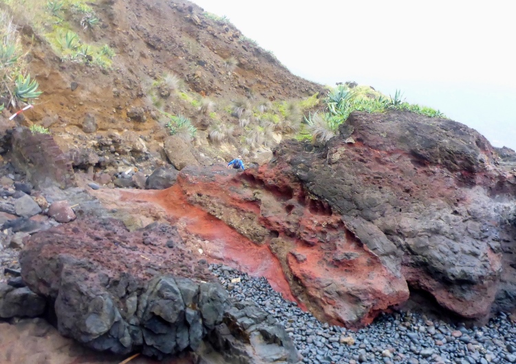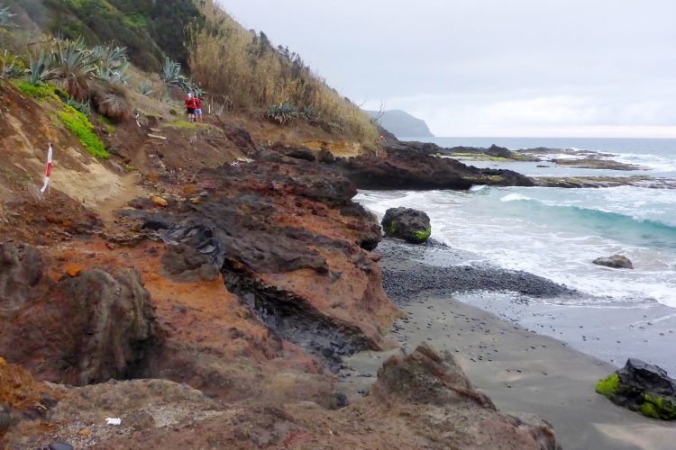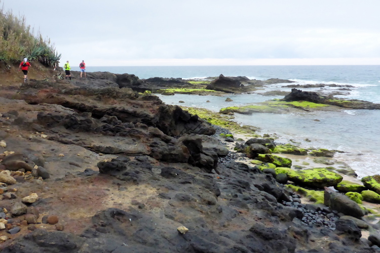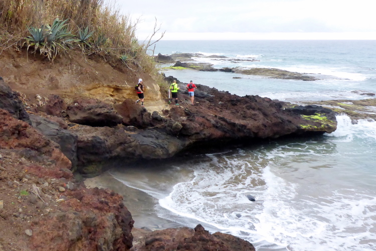 Um 8 Uhr geht es los. Zuerst laufen wir hinab zur Mündung eines kleinen Baches neben dem Hafen. Dann folgen einige Kilometer recht gut laufbare Wege und Trails. Zwischendurch laufen wir an der Grenze zwischen vulkanischem Gestein und Sediment mit Versteinerungen aus dem Tertiär über einen Holzsteg mit Hinweistafeln, die auf die Besonderheiten dieser Region hinweisen.