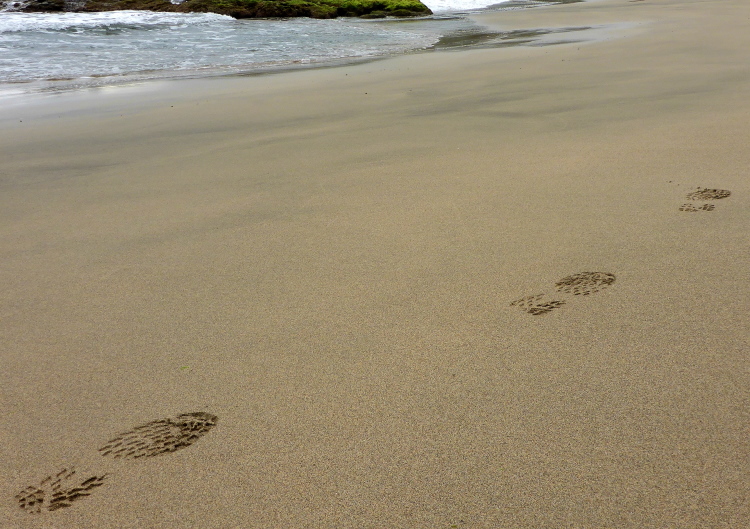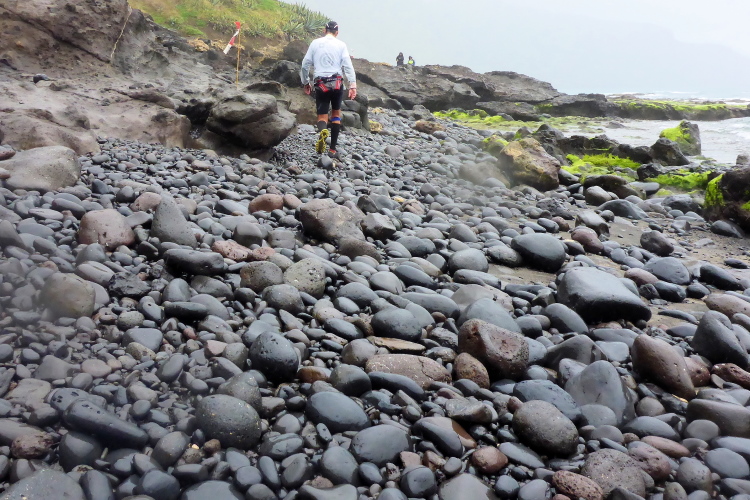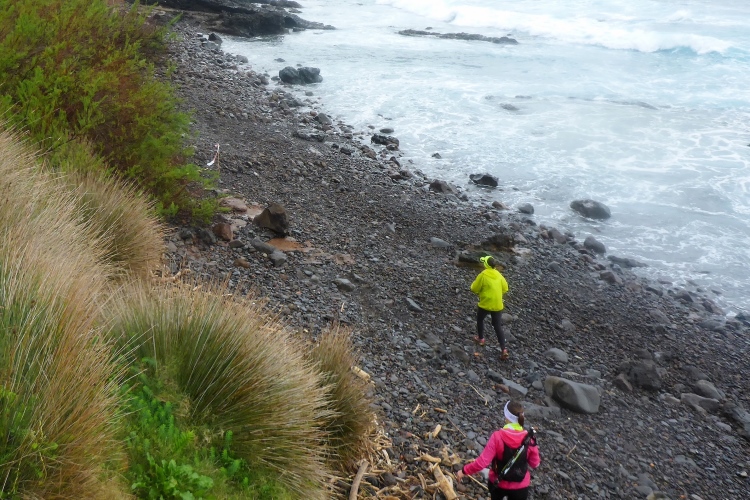 Unten am Ufer wird es genial, der Spaß geht jetzt erst richtig los! Die Strecke führt über schwarzen und roten Fels mit schroffen Kanten, durch Sand und über große runde Steine. Alle paar Meter wechselt die Beschaffenheit des Untergrunds. Recht abenteuerlich, aber nie gefährlich, geht es immer ein paar Meter aufwärts und gleich wieder hinab. Manchmal braucht man auch die Hände, um gut voranzukommen. Inzwischen regnet es leicht. Immer wieder muss ich das Objektiv der Kamera trocken wischen. Der Zeitpunkt des Laufes richtet sich nach den Gezeiten, denn bei Flut kann man auf diesem Streckenabschnitt nicht laufen.