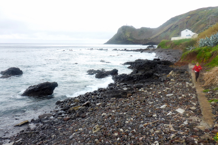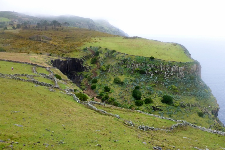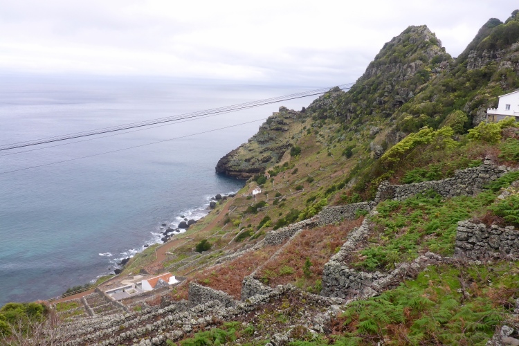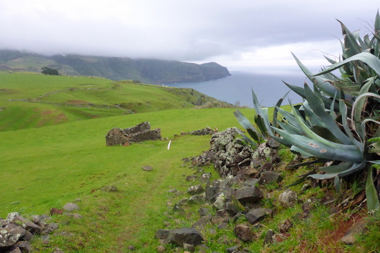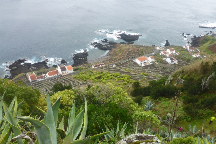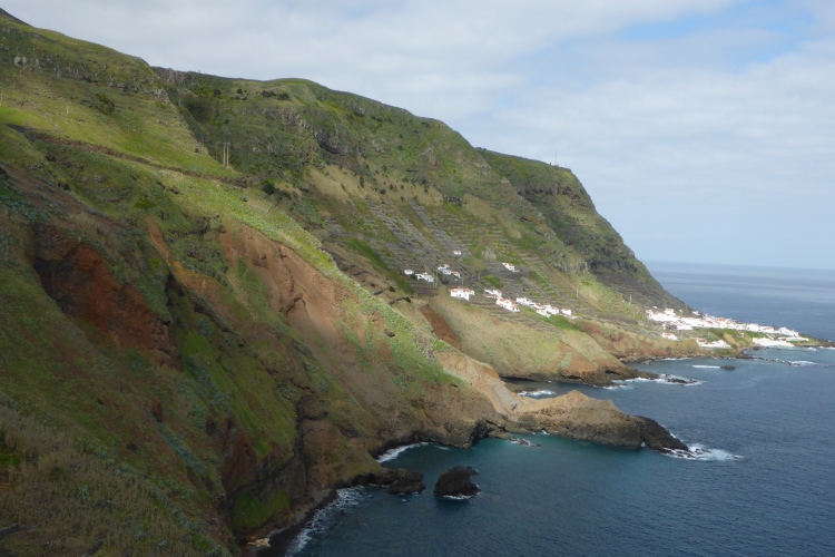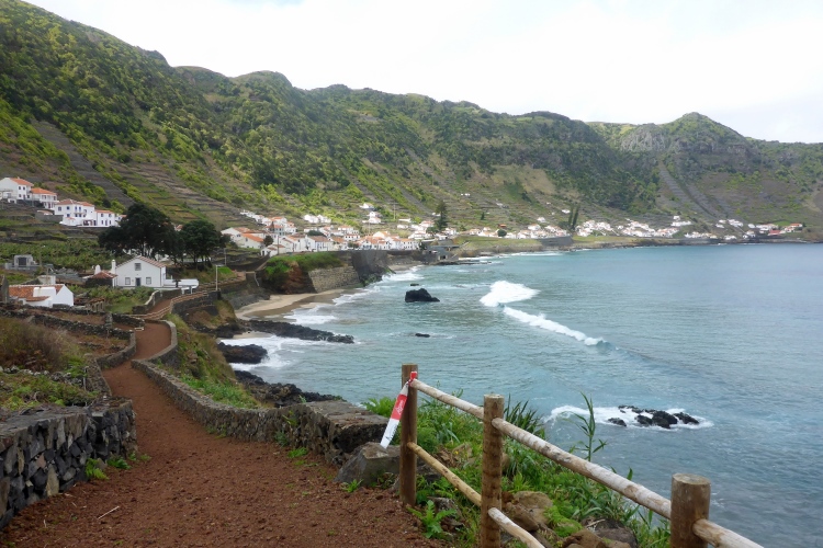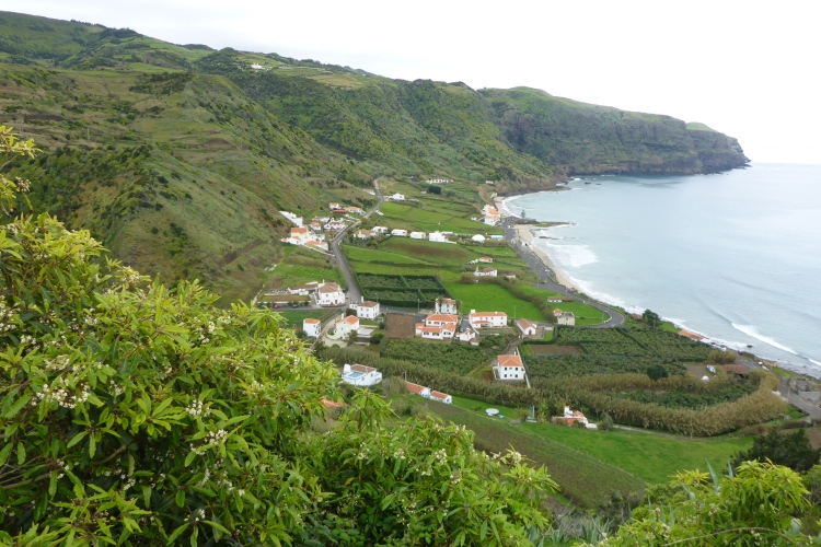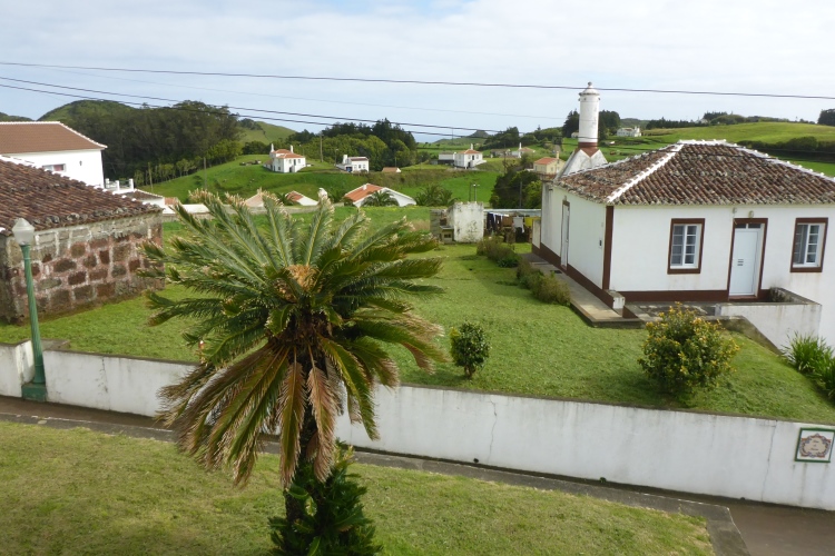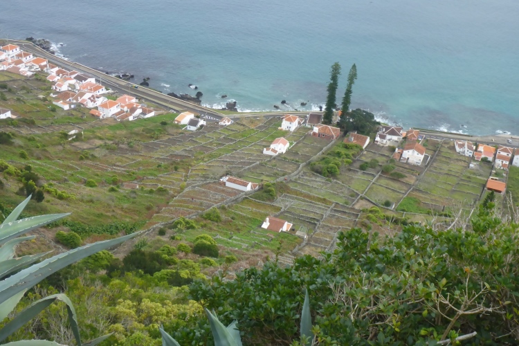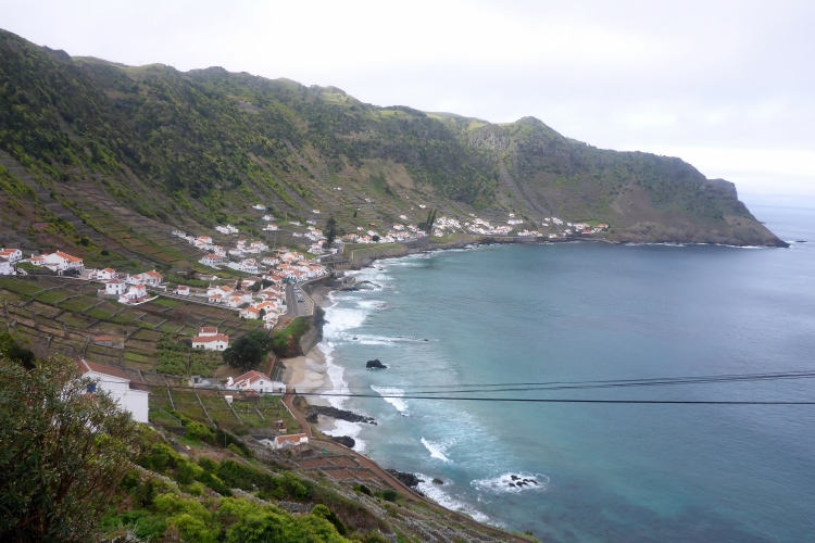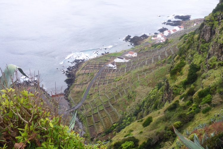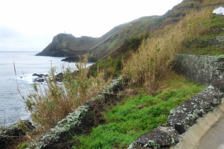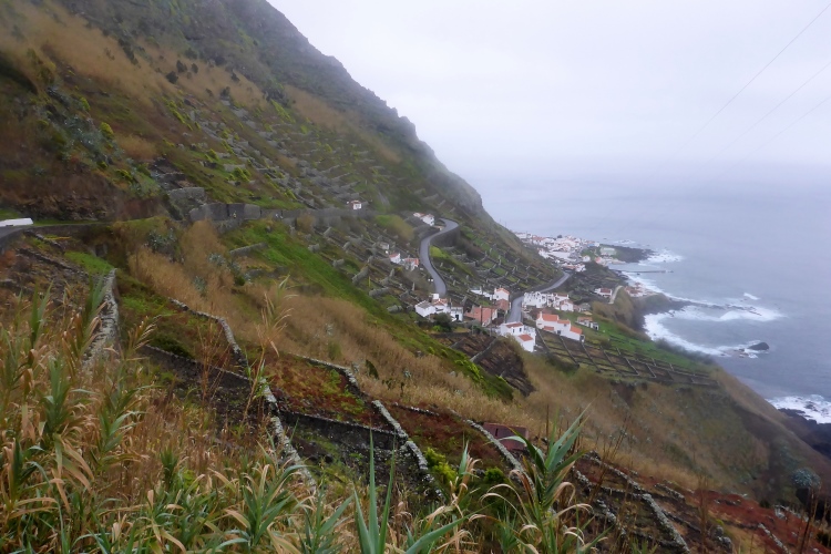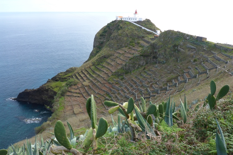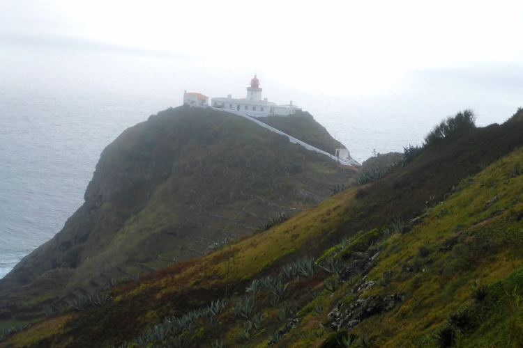 Oberhalb der Bucht von Maia blicke ich bei einem Aussichtspunkt, einer ehemaligen Walbeobachtungsstelle, hinab zum Leuchtturm Goncalo Velho. Dieser war einst sehr bedeutend, denn er ist der erste, den man sieht, wenn man mit dem Schiff von Europa nach Amerika fährt. Bei klarer Sicht erkennt man seinen Lichtschein noch in 70 km Entfernung. Unter mir liegt der Ort Maia, bei dem zwischen vielen schwarzen Steinmauern Wein angebaut wird. Heute wirkt alles recht trübe. Wie viel schöner es hier bei Sonnenschein aussieht, werde ich morgen erfahren (siehe letzter Fotoblock).