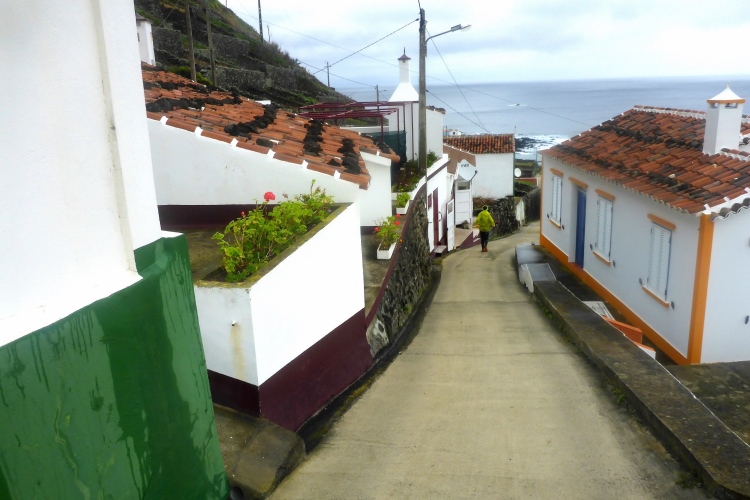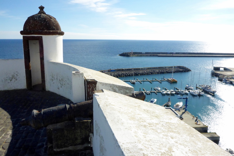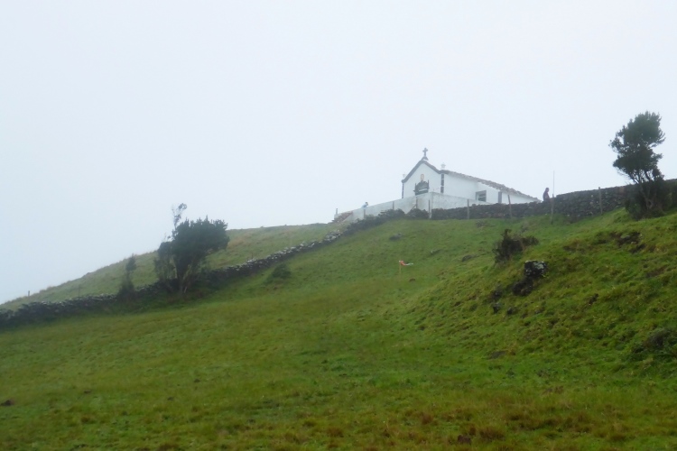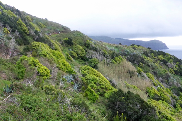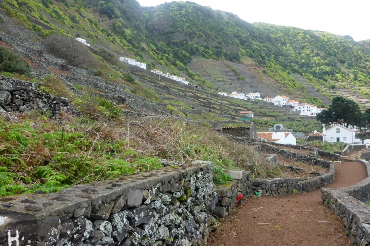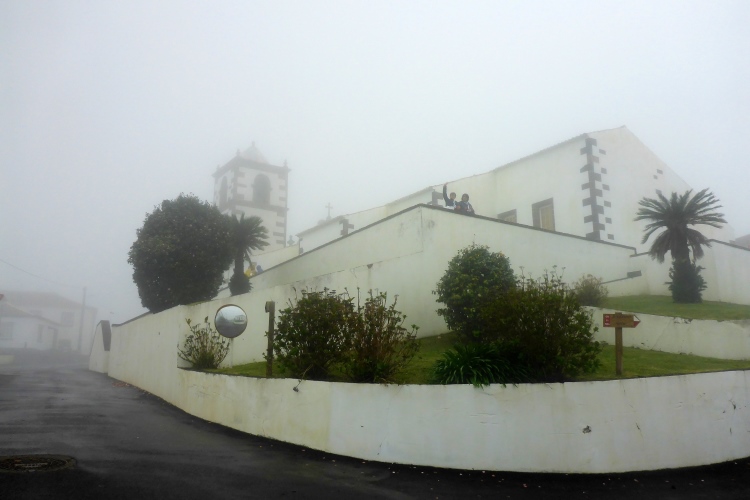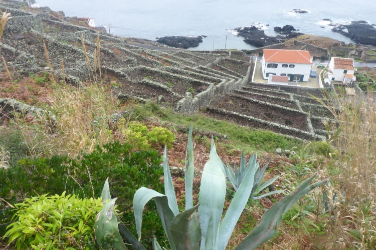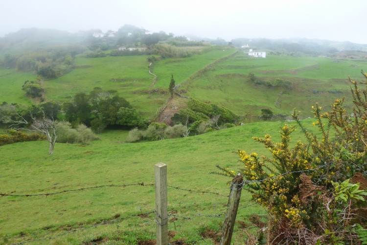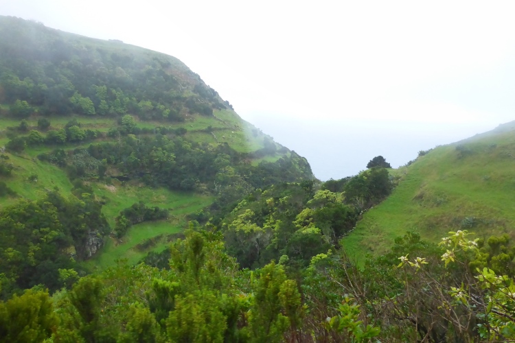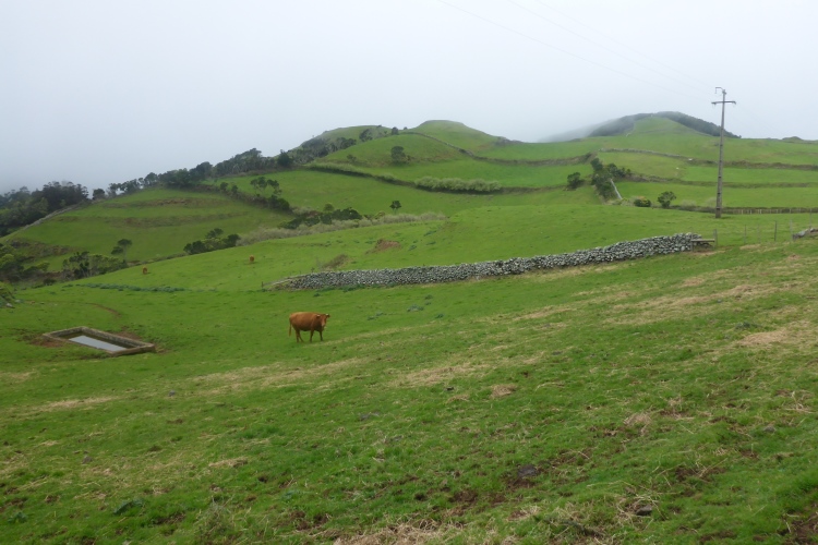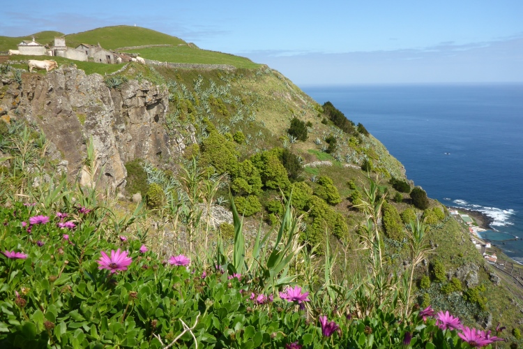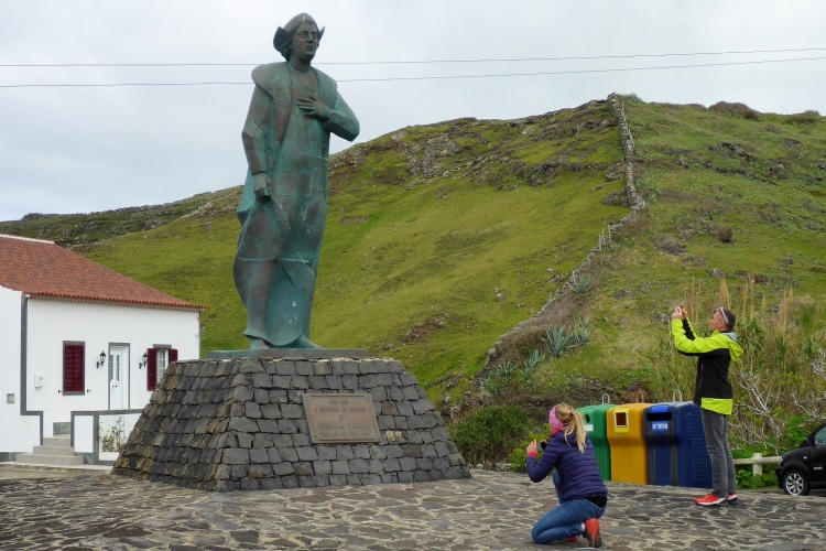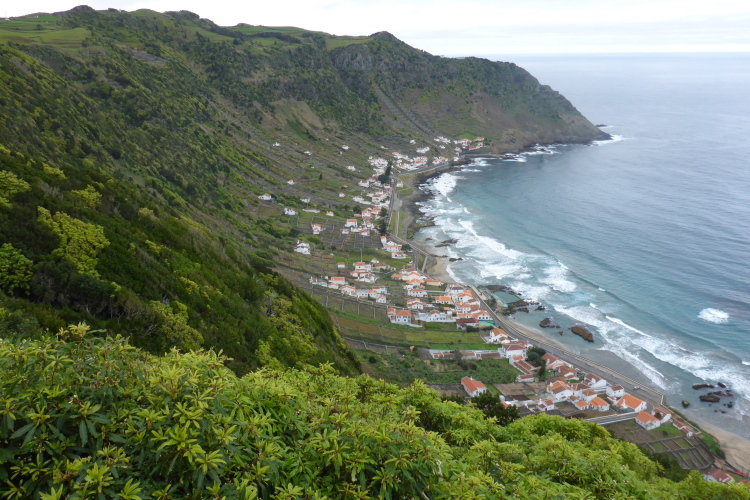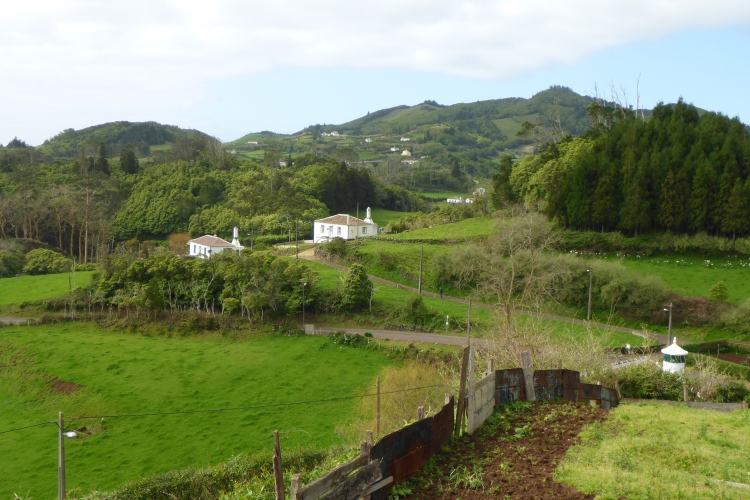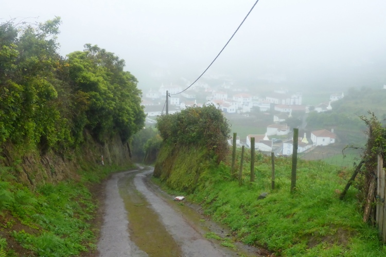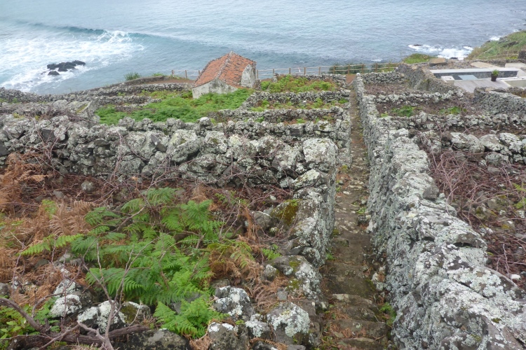 Oberhalb der Bucht von Maia blicke ich bei einem Aussichtspunkt, einer ehemaligen Walbeobachtungsstelle, hinab zum Leuchtturm Goncalo Velho. Dieser war einst sehr bedeutend, denn er ist der erste, den man sieht, wenn man mit dem Schiff von Europa nach Amerika fährt. Bei klarer Sicht erkennt man seinen Lichtschein noch in 70 km Entfernung. Unter mir liegt der Ort Maia, bei dem zwischen vielen schwarzen Steinmauern Wein angebaut wird. Heute wirkt alles recht trübe. Wie viel schöner es hier bei Sonnenschein aussieht, werde ich morgen erfahren (siehe letzter Fotoblock).