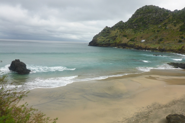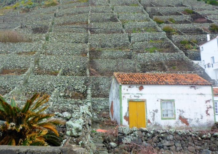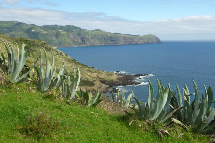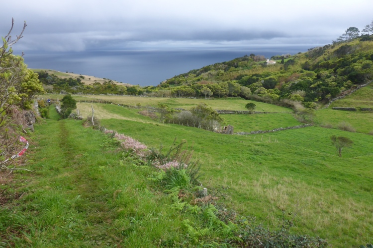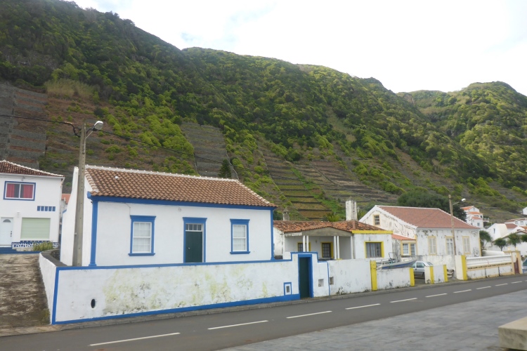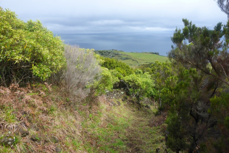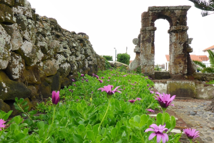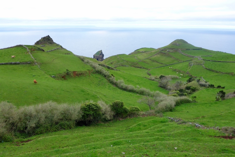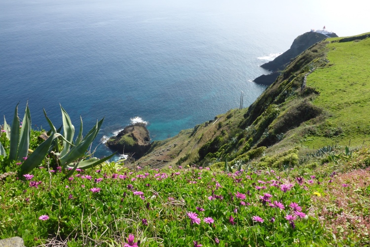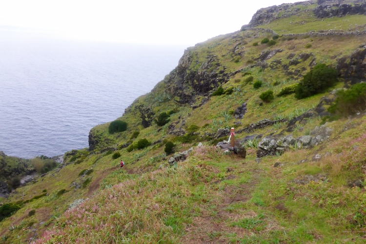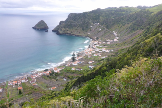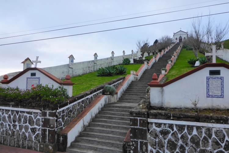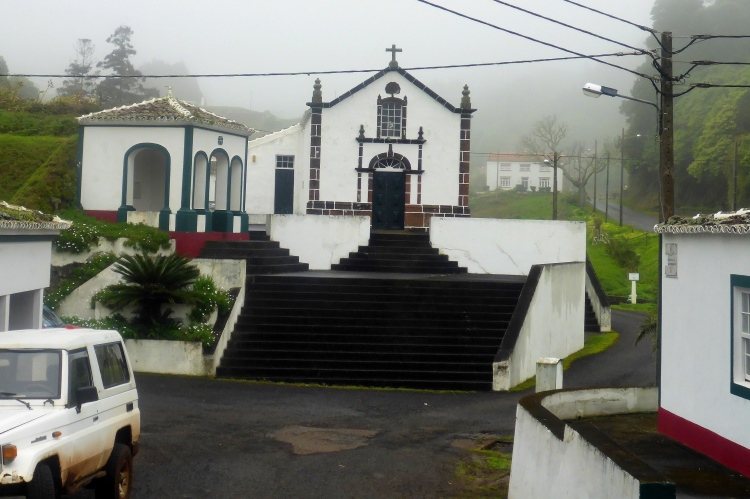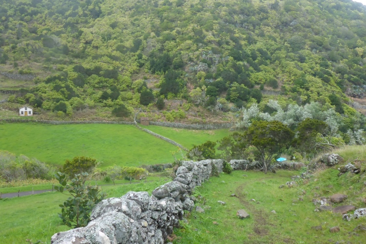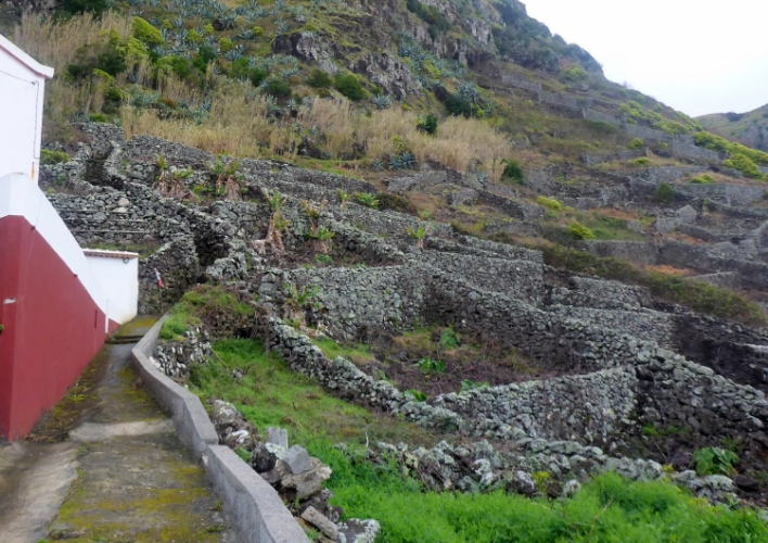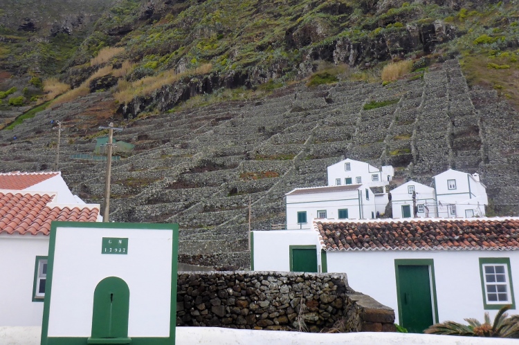 Oberhalb der Bucht von Maia blicke ich bei einem Aussichtspunkt, einer ehemaligen Walbeobachtungsstelle, hinab zum Leuchtturm Goncalo Velho. Dieser war einst sehr bedeutend, denn er ist der erste, den man sieht, wenn man mit dem Schiff von Europa nach Amerika fährt. Bei klarer Sicht erkennt man seinen Lichtschein noch in 70 km Entfernung. Unter mir liegt der Ort Maia, bei dem zwischen vielen schwarzen Steinmauern Wein angebaut wird. Heute wirkt alles recht trübe. Wie viel schöner es hier bei Sonnenschein aussieht, werde ich morgen erfahren (siehe letzter Fotoblock).