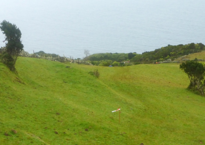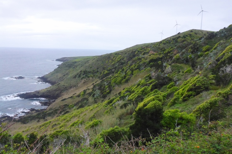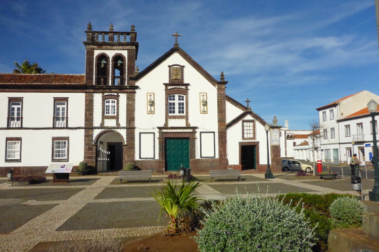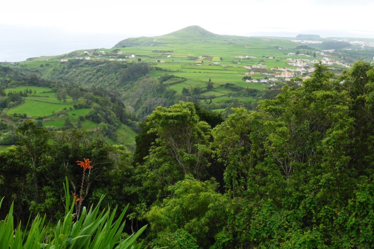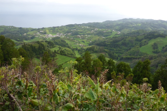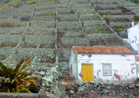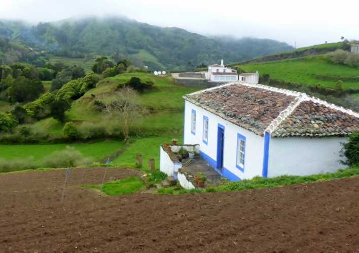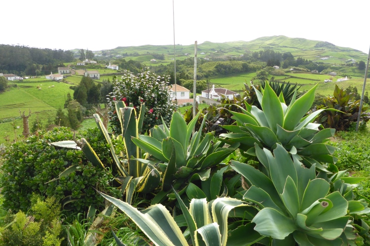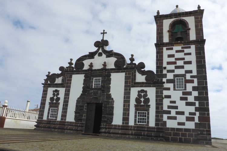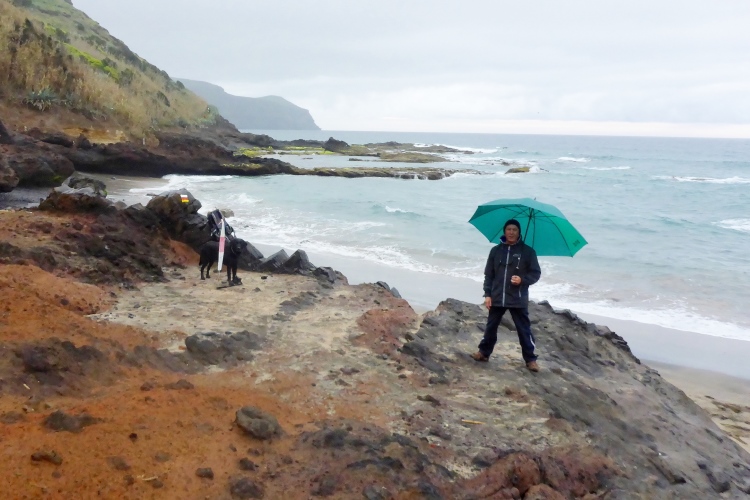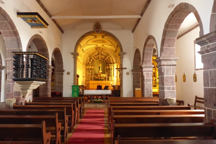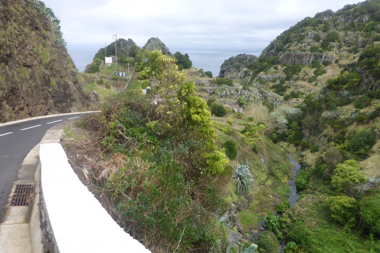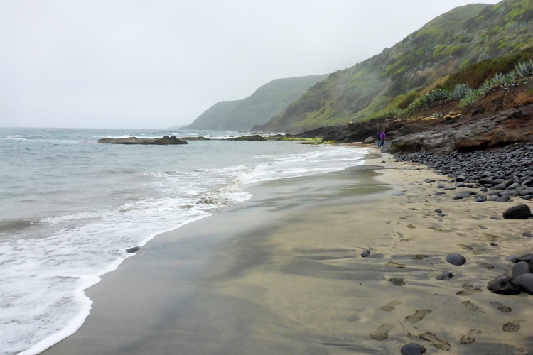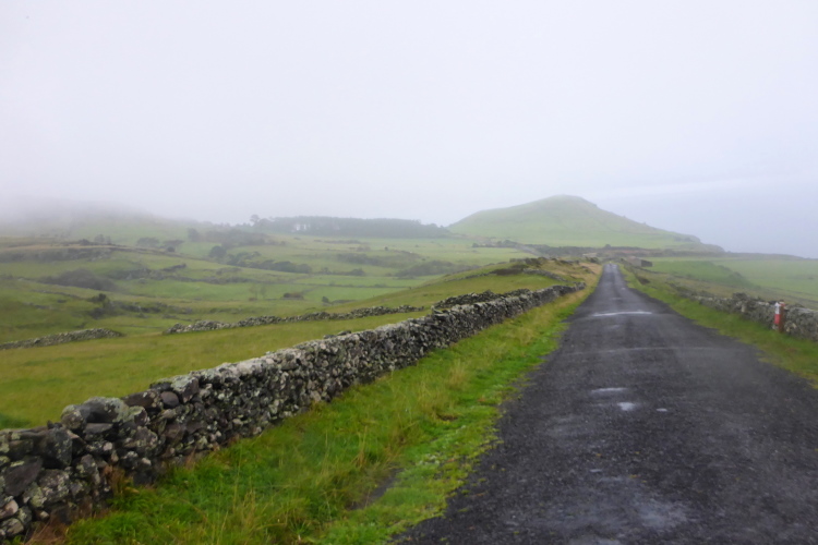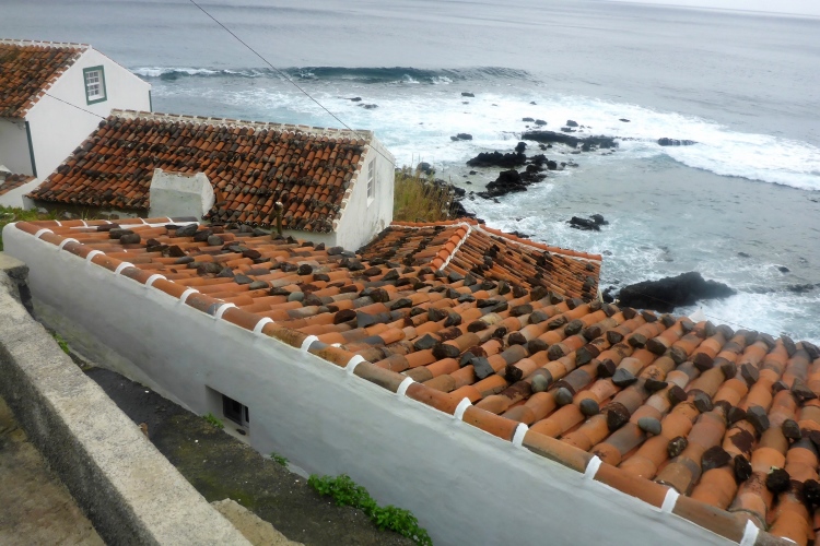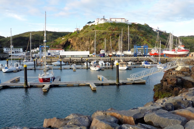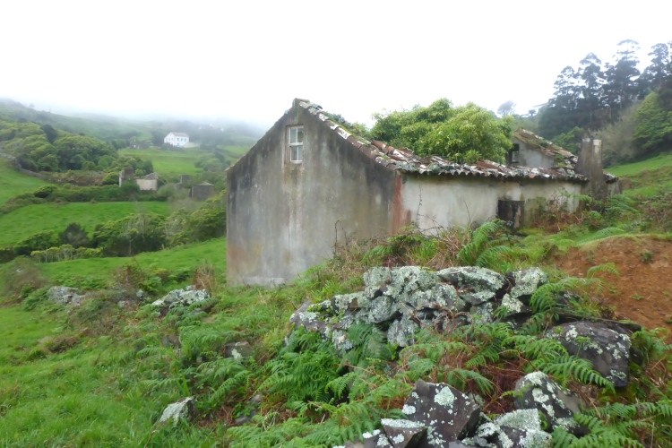 Oberhalb der Bucht von Maia blicke ich bei einem Aussichtspunkt, einer ehemaligen Walbeobachtungsstelle, hinab zum Leuchtturm Goncalo Velho. Dieser war einst sehr bedeutend, denn er ist der erste, den man sieht, wenn man mit dem Schiff von Europa nach Amerika fährt. Bei klarer Sicht erkennt man seinen Lichtschein noch in 70 km Entfernung. Unter mir liegt der Ort Maia, bei dem zwischen vielen schwarzen Steinmauern Wein angebaut wird. Heute wirkt alles recht trübe. Wie viel schöner es hier bei Sonnenschein aussieht, werde ich morgen erfahren (siehe letzter Fotoblock).
