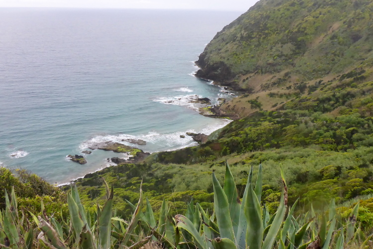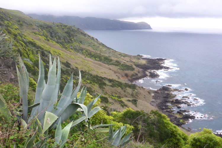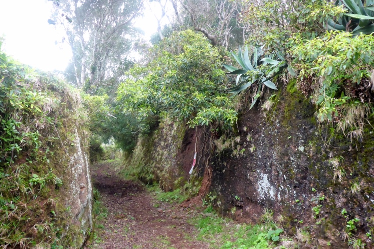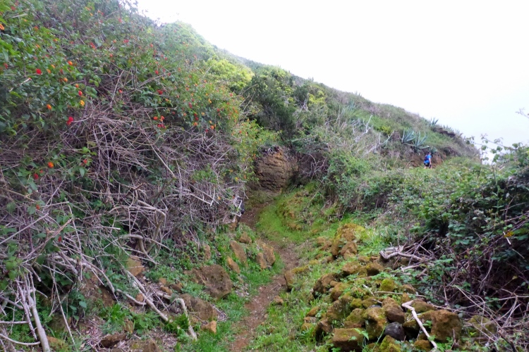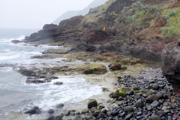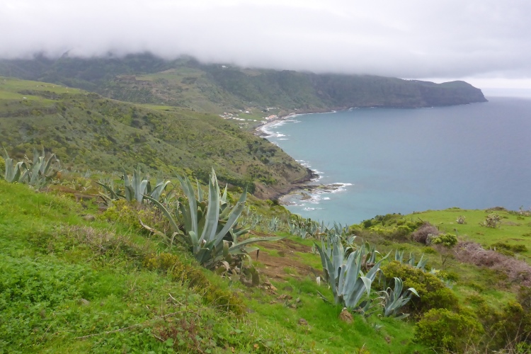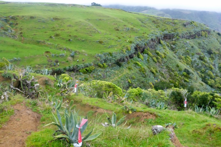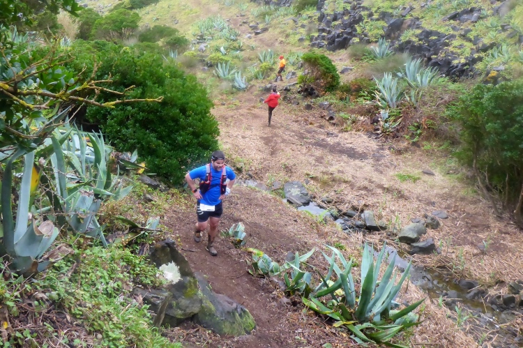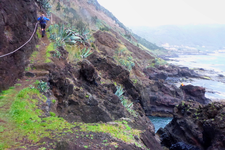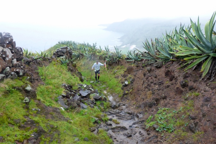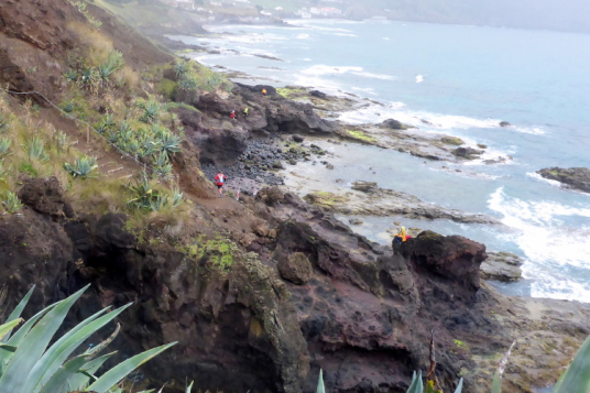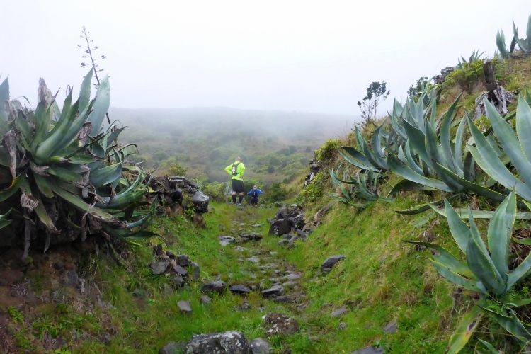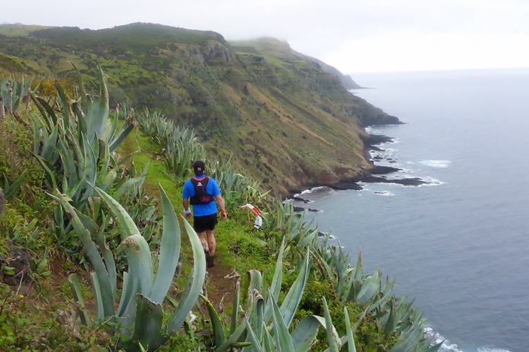 Dann geht es in häufigem Wechsel zwischen kurzen Auf- und Abstiegen entlang der Steilküste. Letztes Jahr fand die Premiere des Columbus Trail bei herrlichem Sonnenschein statt. Jetzt verhindern grauer Himmel, graues Meer und Wolken bis auf etwa 300 m Höhe typische Postkartenfotos. Doch Agaven und andere exotische Pflanzen um mich herum sowie die abwechslungsreiche Strecke versetzen mich trotzdem in eine andere Welt. Laufen, wo andere nur Urlaub machen - das ist MEIN Leben!