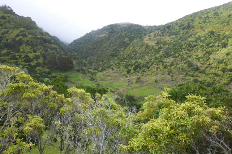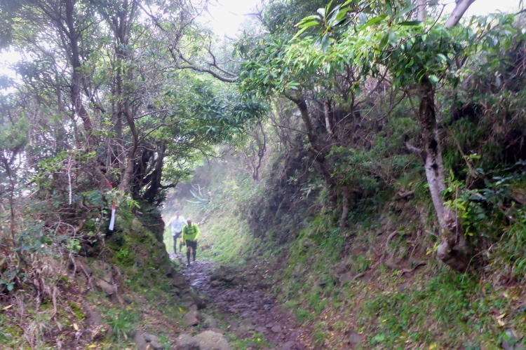 Vor allem auf den Bergen in der Mitte der Insel gibt es noch viel von dem ursprünglichen Wald. Zum Pico Alto führt nur die 77 km Strecke. Aber auch über den Rest der Insel verteilt blieben bis heute noch viele kleine Flecken dieser Urwälder unberührt erhalten und erfreuen uns auch auf der Marathonstrecke. Die Atmosphäre auf diesen Streckenabschnitten ist ganz anders als in unseren mitteleuropäischen Wäldern. Oft laufen wir heute aber auch durch landwirtschaftlich geprägte Regionen. Da es hier keine Monokulturen gibt, empfinde ich diese Hügelland als Agrar-Idylle. Zwei wichtige Wirtschaftsfaktoren auf der Insel sind Viehzucht und der Anbau von Melonen.
