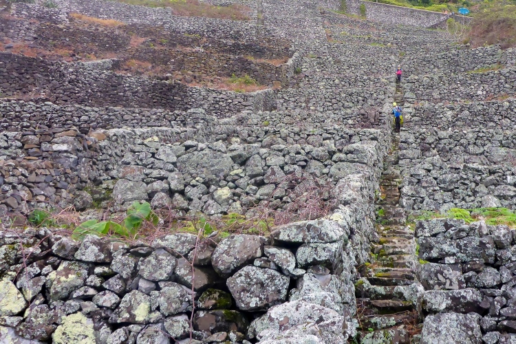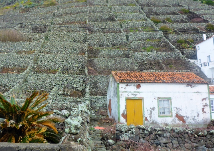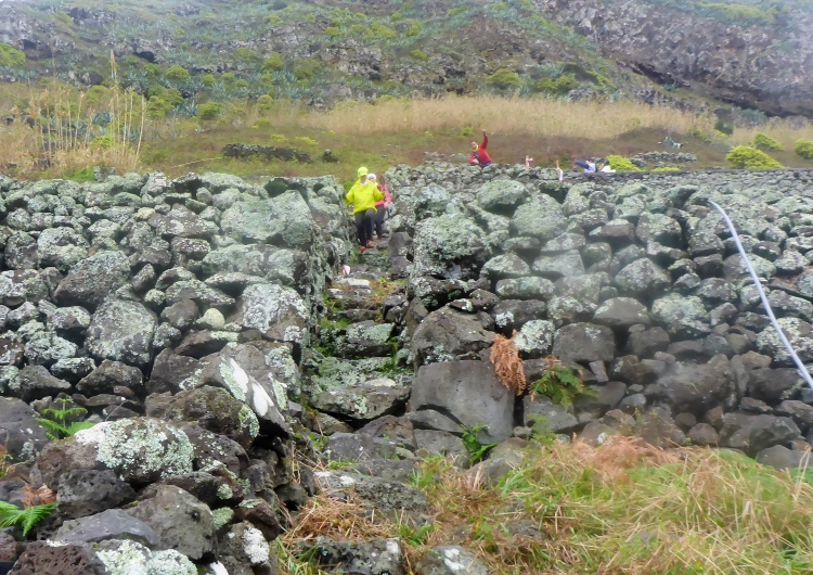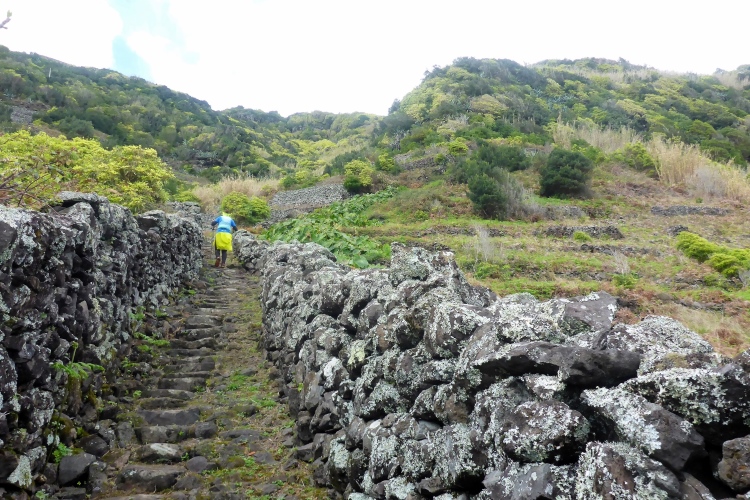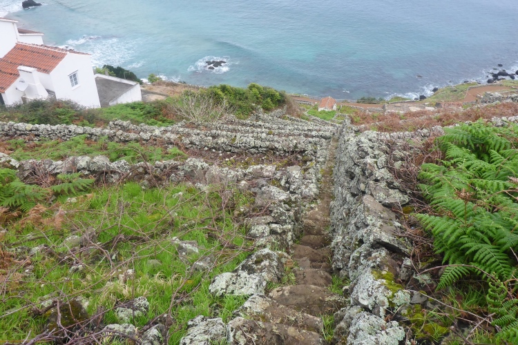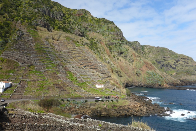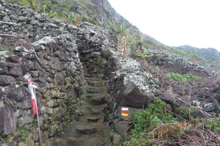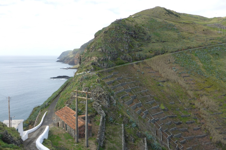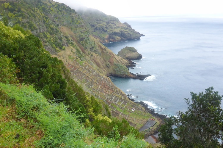 Dann erreiche ich die Bucht von São Lourenço, die durch den Einsturz eines Vulkankraters entstanden ist. Schon wieder sehe ich diese faszinierenden Weingärten am Steilhang vor mir. Erneut führt eine Treppe verdammt steil in die Tiefe. Allen Hochhaus-Treppenläufern sei gesagt: auf dieser Insel warten ganz neue Herausforderungen auf euch!