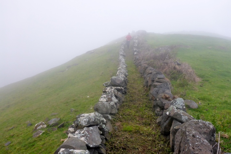 Oben umgibt mich leider bald wieder Nebel, jetzt regnet es auch stärker. Einmal bin ich mit Mauro und zwei Marathonläuferinnen oberhalb einer steilen Küste, kann aber vom Meer weit unter mir nur die weiße Gischt der Brandung erkennen.