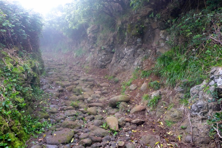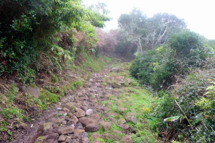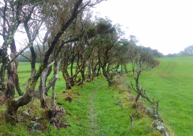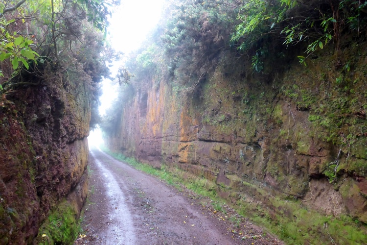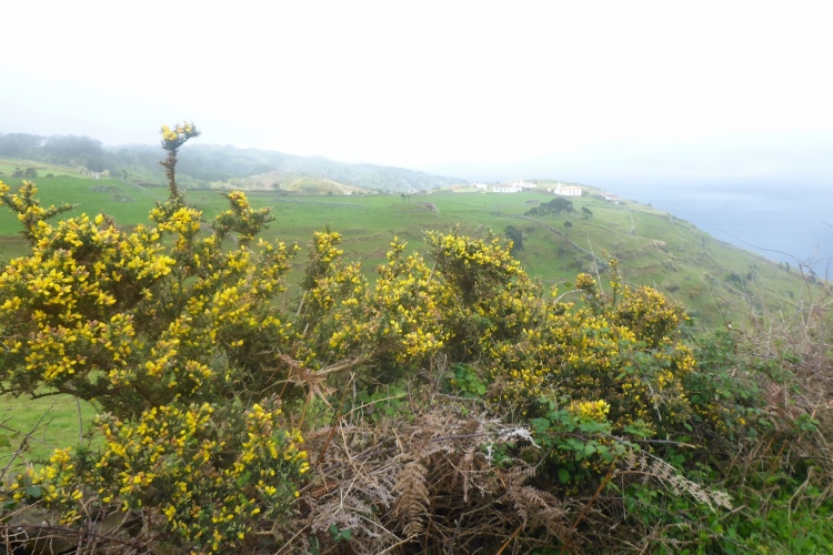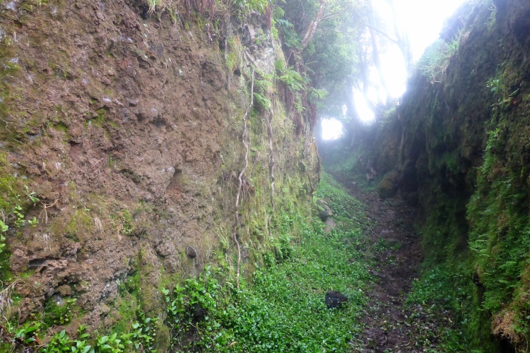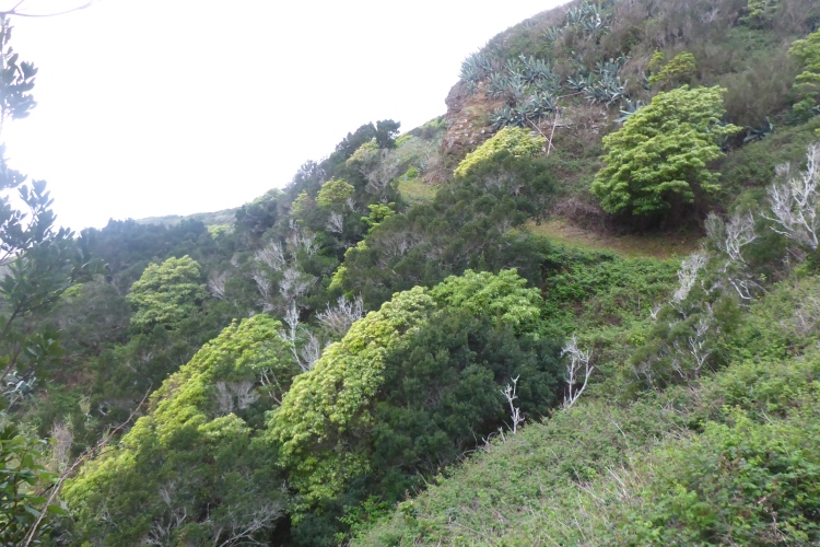 Nun geht es wieder steil bergauf, mal auf schmalen Pfaden, mal durch schlammige Hohlwege, mal auf Asphalt. Der Regen lässt die Aussicht auf die Bucht im trüben Grau verschwimmen. Bei Sonnenschein und blauem Meer muss es hier sehr schön sein. Die interessante Vegetation entschädigt für die fehlende Aussicht.