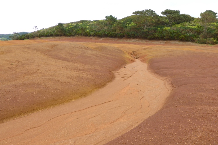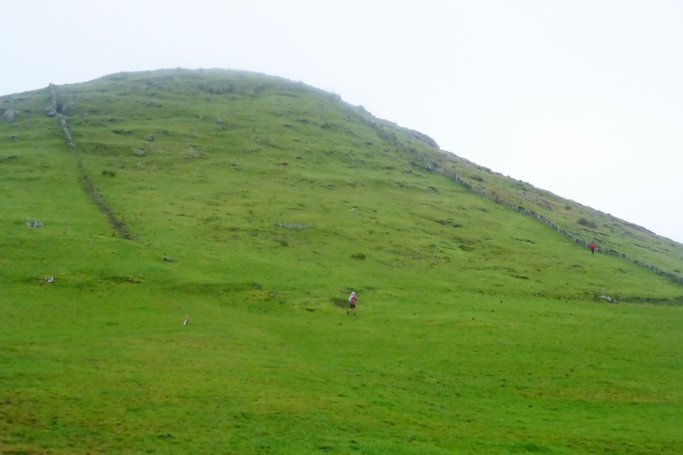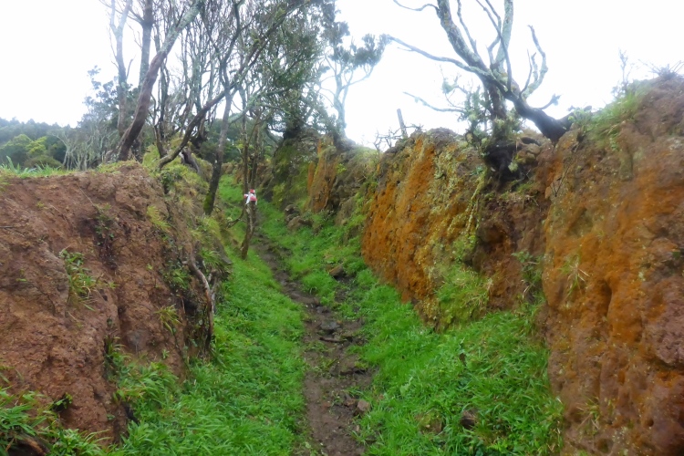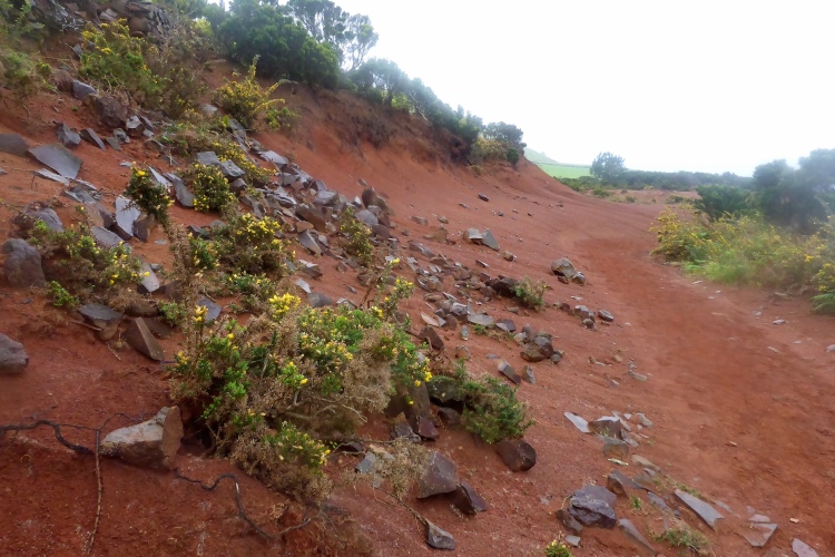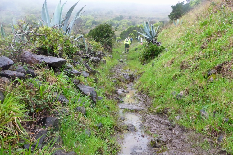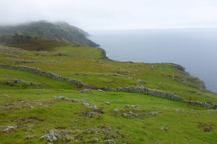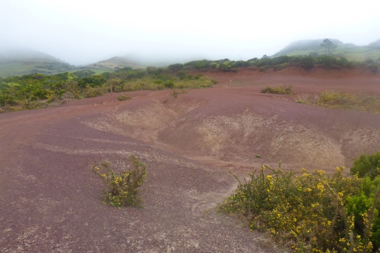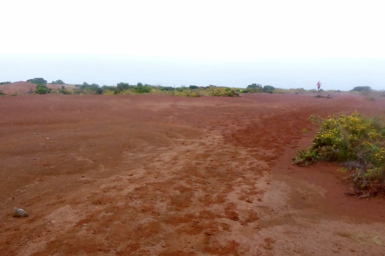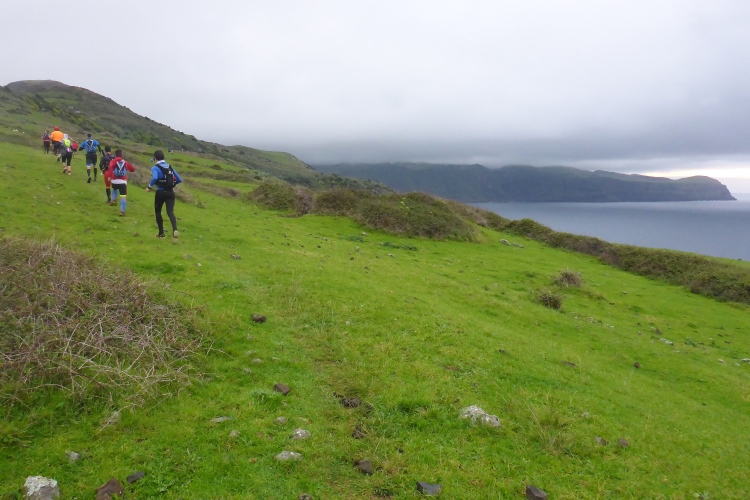Nach etwa neun Kilometern erreiche ich die erste Verpflegungsstelle. Die Abstände zwischen den VP betragen durchschnittlich etwa 10 km. Bald folgt ein Hohlweg mit tiefem Schlamm. Welch ein Spaß! Hier bin ich am rechten Platz! Wolken und Nebel verhüllen den Blick auf die Berge und hinab zum Meer. Ich laufe durch eine friedliche Gegend zwischen Natur und dezenter Landwirtschaft. Genau richtig, um die Seele baumeln zu lassen. Ein kurzes Stück geht über roten Sand, gewissermaßen die Miniversion der roten Wüste. Auf einer Wiese sehe ich vor mir, wie die Läufer einen steilen Hügel hinauf marschieren. Oben berauscht mich dann die Aussicht auf Steilküste.