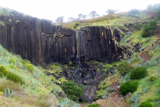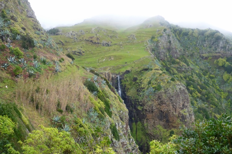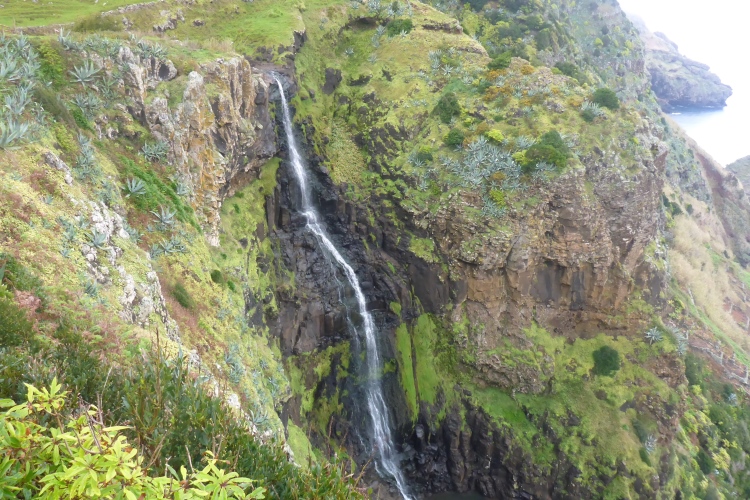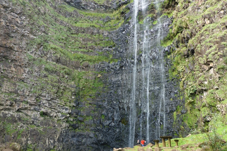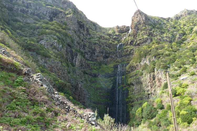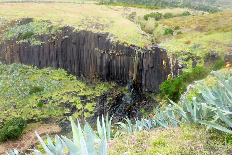 Bald erreiche ich den Wasserfall Ribeira dos Maloás, der von wuchtige Basaltsäulen umrahmt wird. Wir steigen direkt neben dem Wasserfall auf und können diesen faszinierenden Anblick aus verschiedenen Perspektiven genießen.
