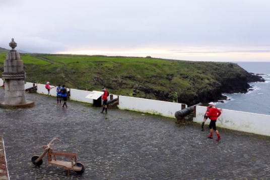 Am Samstagmorgen werden die Läufer des Marathon und des Ultratrail vom Hotel zum Startgelände am unteren Ende des Städtchens gebracht. Die Forte de Sao Brás, eine Festung aus dem 16. Jahrhundert, bietet mit ihren aufs Meer gerichteten alten Kanonen eine interessante Kulisse für unsere Dehnübungen. Hier ist später auch das Ziel für die Halbmarathonis, die Ultratrailer und Ort der Abschlussparty.