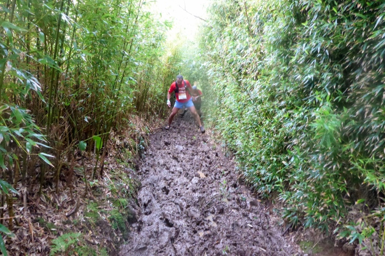 Weiterhin wechselt die Strecke häufig zwischen sehr ruppigem und eher harmlosen Untergrund Obwohl hier die meisten Teilnehmer ohne Stöcke laufen, sind diese auf so einer Strecke zumindest bei nasser Witterung nützlich. Ich bin ohnehin ein klassischer Stock-Läufer und es gewohnt, vor allem bei steilen Aufstiegen die Kraft auf Beine und Arme zu verteilen. Heute ging einer meiner Stöcke schon nach 70 Minuten kaputt. Mit nur einem komme ich spürbar langsamer voran als mit beiden, zumal ich auch bergab heute vorsichtiger laufe als normal, da ich so kurz vor dem Marathon des Sables auf glitschigem Schlamm oder rutschigen Steinen keine Verletzung mehr riskieren will.
