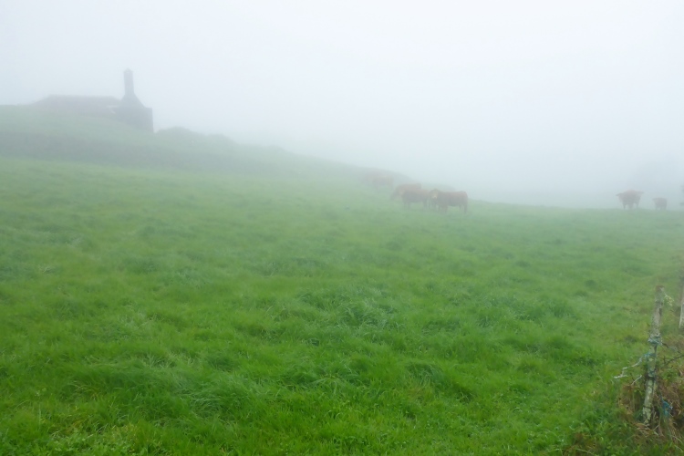 Zuerst gibt es noch einmal schöne Aussicht auf die Küste, dann geht es mal wieder hinauf in den Nebel. Schade, ich hätte gerne mehr vom Hügelland gesehen und ab und zu auf ein blaues Meer hinab geblickt, aber auch Nebelszenerien haben durchaus faszinierende Aspekte. Hier oben weht auf Wiesengelände ein kühler Wind, aber in den Hohlwegen und den Wäldern ist es angenehm.