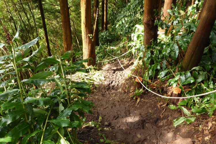 Das letzte Stück hinab zum Dorf führt über eine sehr steile, heute etwas rutschige Treppe. Im letzten Jahr konnte der gesamte Trail bei trockenen Steinen und nahezu ohne Schlamm gelaufen werden, heute müssen wir deutlich mehr aufpassen.