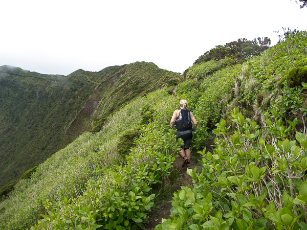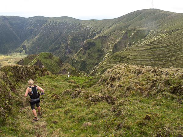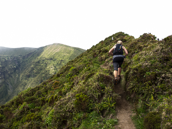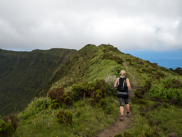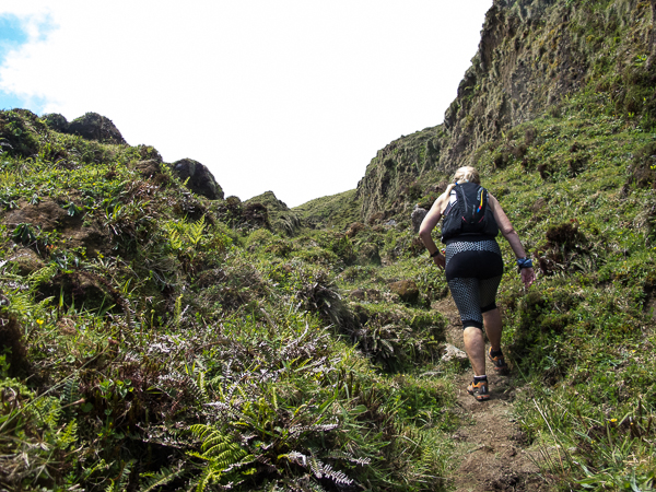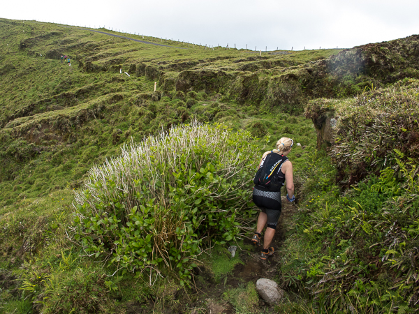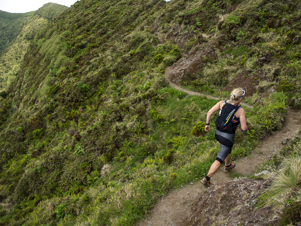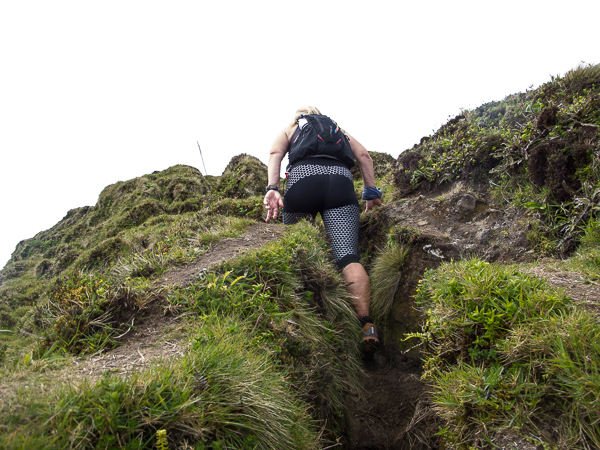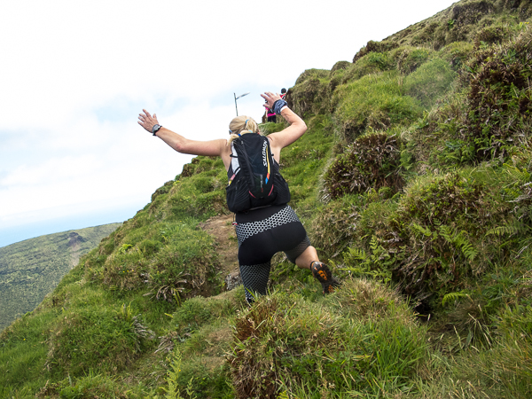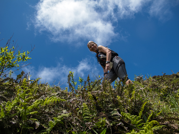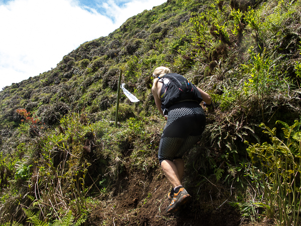 Doch zurück in meine Welt. Kaum schau ich auf, hat der Berg Pico sein Wolkenkleid gewechselt. Nun ziert sein schwarzes Antlitz ein Seidenschal aus Schleierwolken. Völlig unspektakulär ist die höchste Stelle erreicht. Mühsam und somit zeitraubend sind die nächsten Kilometer, denn das Abwärtslaufen über die wahllos verteilten Grasbüschelbrocken wird zur Tortur. Ich wüsste zu gerne, wie die Profisportler hier durchbrettern. Bevor ich darüber länger nachdenken kann, muss ich klettern. Die Hände suchen Halt, an Steinen oder in dichten Sträuchern. Ich bin wirklich glücklich, was sag ich, dankbar darüber, dass es auf der Insel keine Schlangen oder andere gefährliche Tiere geben soll.