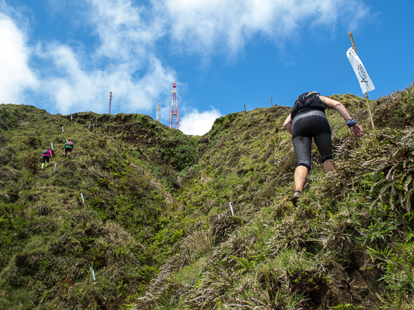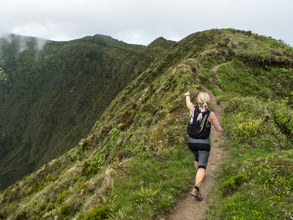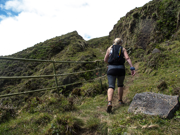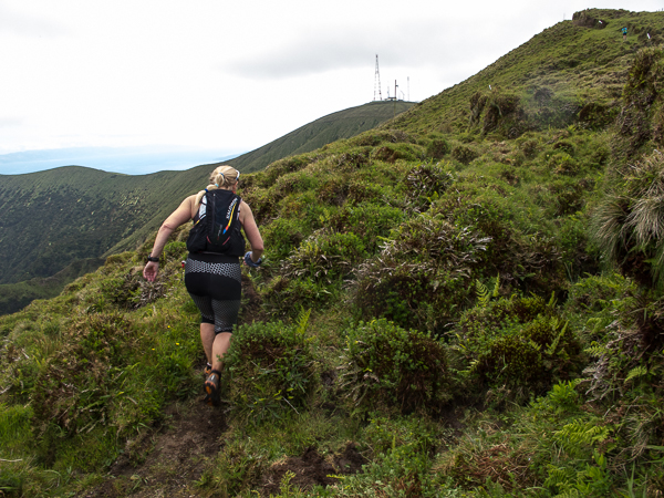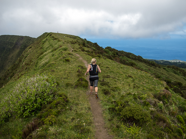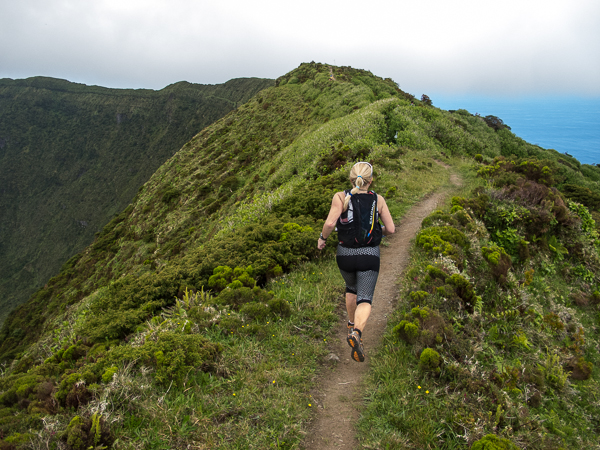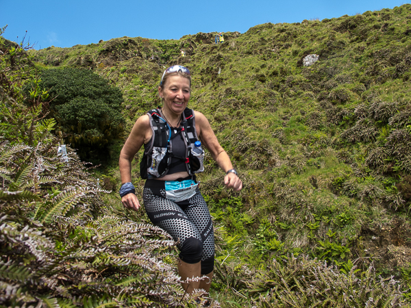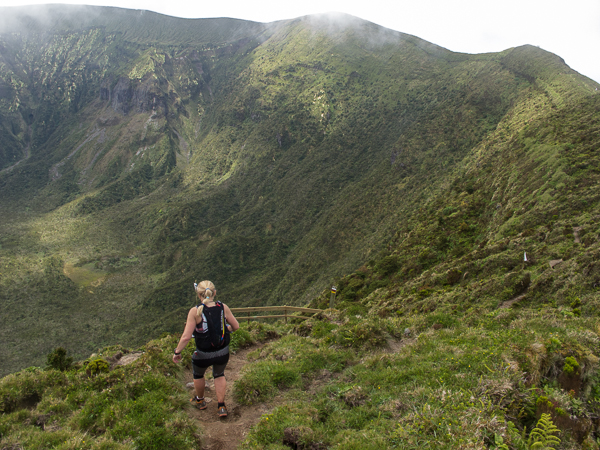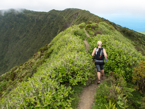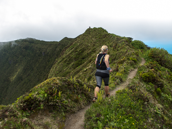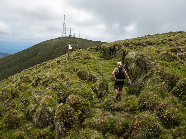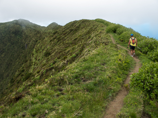 Doch zurück in meine Welt. Kaum schau ich auf, hat der Berg Pico sein Wolkenkleid gewechselt. Nun ziert sein schwarzes Antlitz ein Seidenschal aus Schleierwolken. Völlig unspektakulär ist die höchste Stelle erreicht. Mühsam und somit zeitraubend sind die nächsten Kilometer, denn das Abwärtslaufen über die wahllos verteilten Grasbüschelbrocken wird zur Tortur. Ich wüsste zu gerne, wie die Profisportler hier durchbrettern. Bevor ich darüber länger nachdenken kann, muss ich klettern. Die Hände suchen Halt, an Steinen oder in dichten Sträuchern. Ich bin wirklich glücklich, was sag ich, dankbar darüber, dass es auf der Insel keine Schlangen oder andere gefährliche Tiere geben soll.
