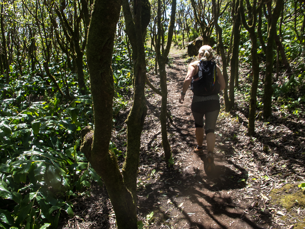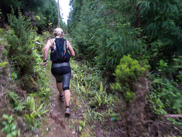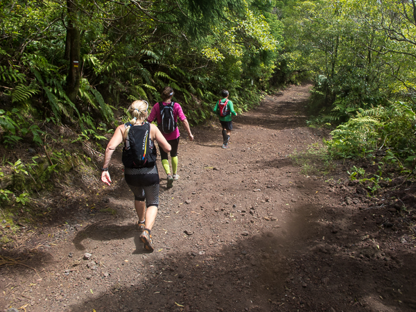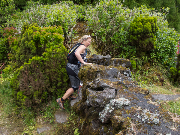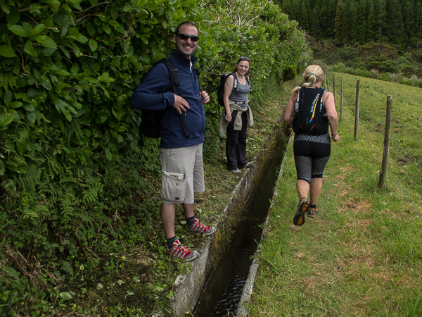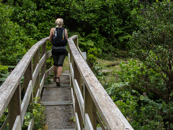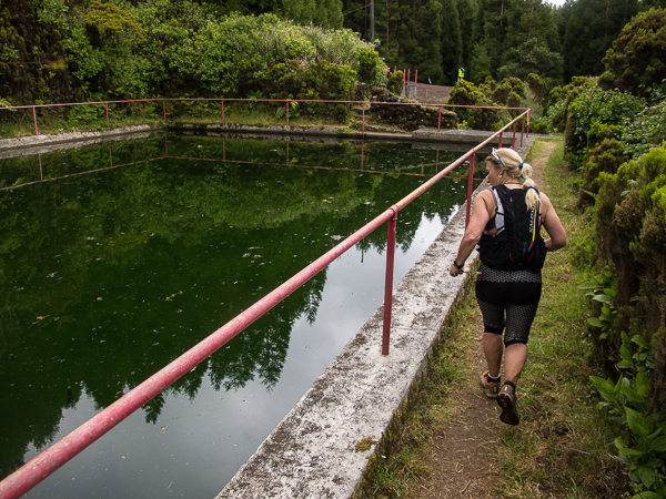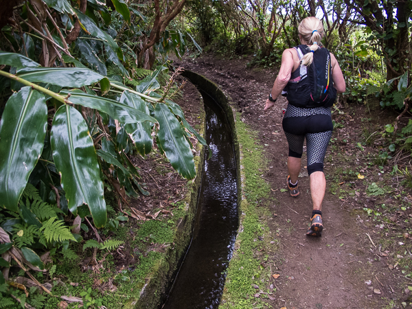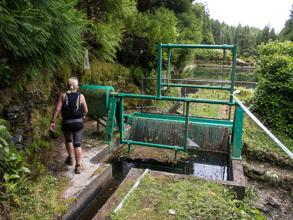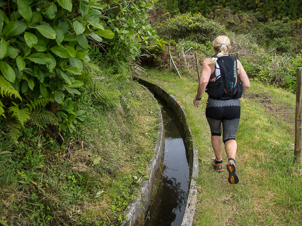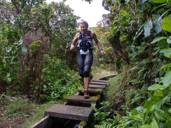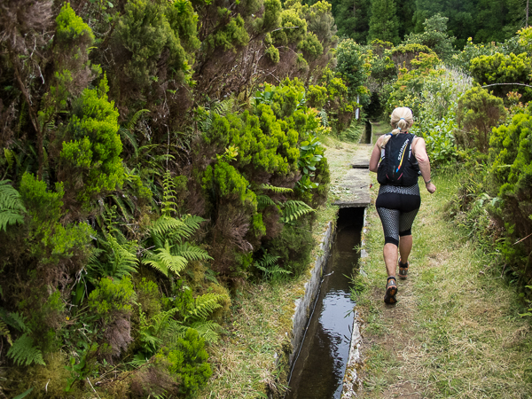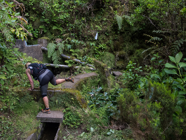 Durch eine enge Waldschneise in Faials verwunschenen Naturpark schlängeln sich die kilometerlange Levada und ich. Die Levadas der Caldeira waren einst Teil eines Wassersammelsystems, das ein Wasserkraftwerk in Varadouro speiste. Durch das Erdbeben von 1998 wurden weite Teile der damaligen fast zehn kilometerlangen Levada zerstört. Heute ist der Wasserweg wieder hergestellt und ich springe immer wieder über diese offene Wasserleitung oder steige über kleine Mäuerchen, um die Seite zu wechseln. Es ist gar nicht so einfach, nach so vielen gelaufenen Stunden mit steifen Knochen noch elegant über die auseinanderstehenden Tritthilfen zu balancieren. Nach und nach bekomme ich Gefallen daran und die Schritte darüber werden lockerer und mutiger. Auch wenn die Knochen schmerzen, macht es Spaß, immer wieder über die Steine hinweg zu springen. Schlagartig wird es wieder drückend schwül. Wäre die Holzbrücke, über die ich nun laufe, eine Hängebrücke, dann könnte man glauben, ich wäre am Amazonas.