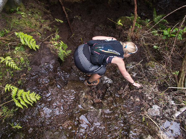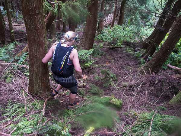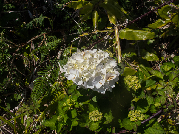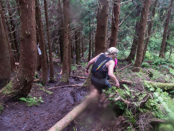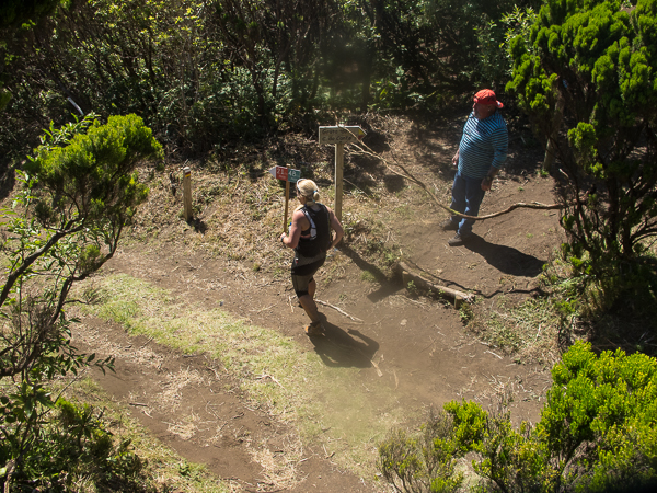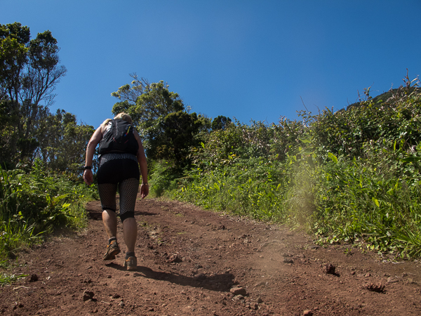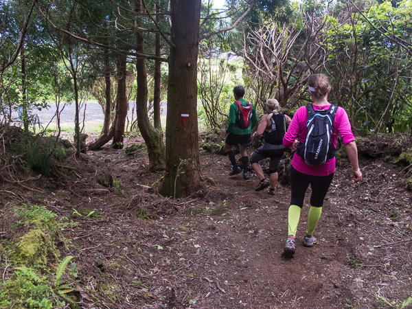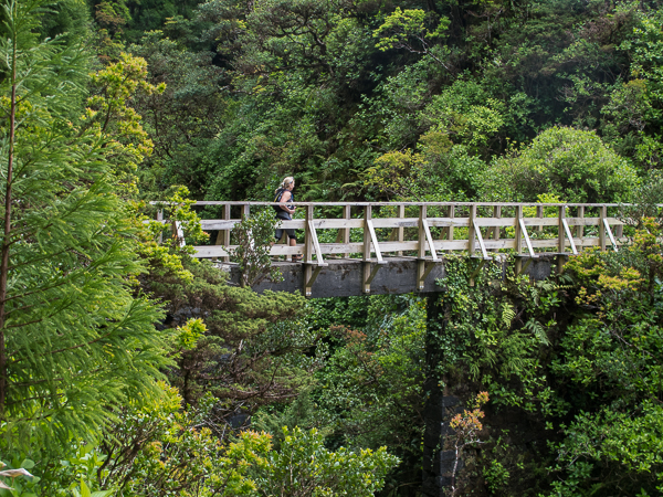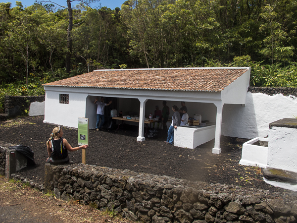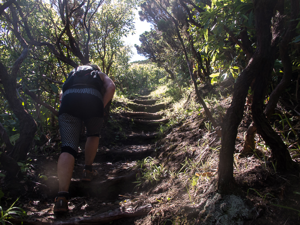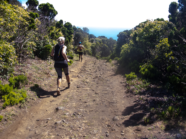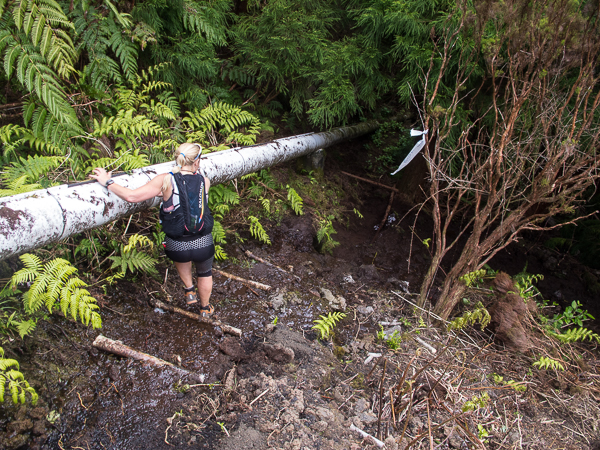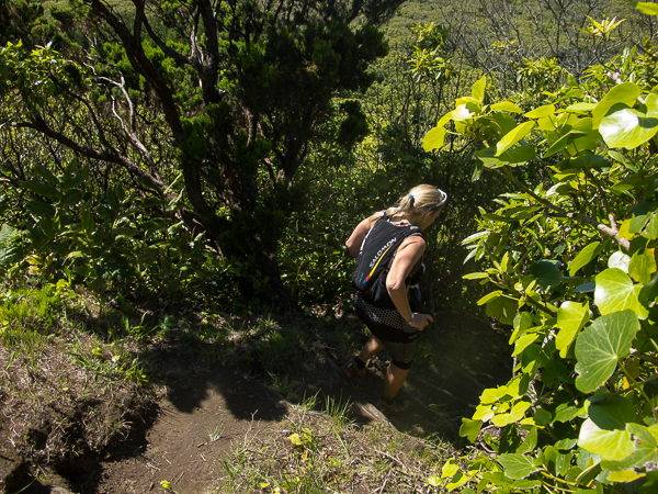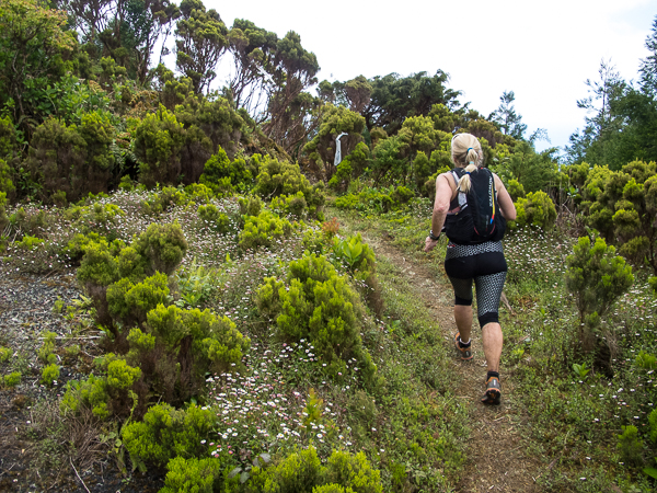 Durch eine enge Waldschneise in Faials verwunschenen Naturpark schlängeln sich die kilometerlange Levada und ich. Die Levadas der Caldeira waren einst Teil eines Wassersammelsystems, das ein Wasserkraftwerk in Varadouro speiste. Durch das Erdbeben von 1998 wurden weite Teile der damaligen fast zehn kilometerlangen Levada zerstört. Heute ist der Wasserweg wieder hergestellt und ich springe immer wieder über diese offene Wasserleitung oder steige über kleine Mäuerchen, um die Seite zu wechseln. Es ist gar nicht so einfach, nach so vielen gelaufenen Stunden mit steifen Knochen noch elegant über die auseinanderstehenden Tritthilfen zu balancieren. Nach und nach bekomme ich Gefallen daran und die Schritte darüber werden lockerer und mutiger. Auch wenn die Knochen schmerzen, macht es Spaß, immer wieder über die Steine hinweg zu springen. Schlagartig wird es wieder drückend schwül. Wäre die Holzbrücke, über die ich nun laufe, eine Hängebrücke, dann könnte man glauben, ich wäre am Amazonas.