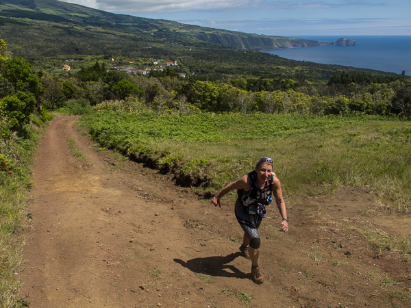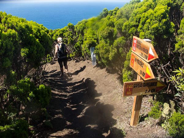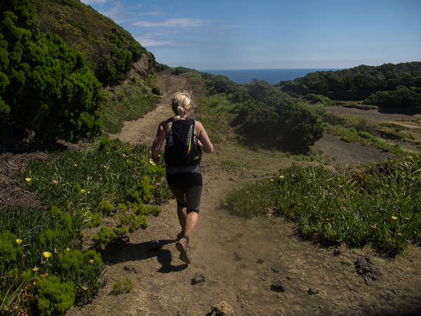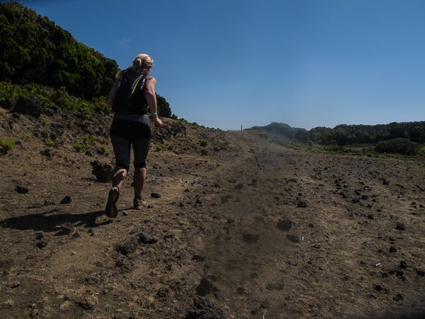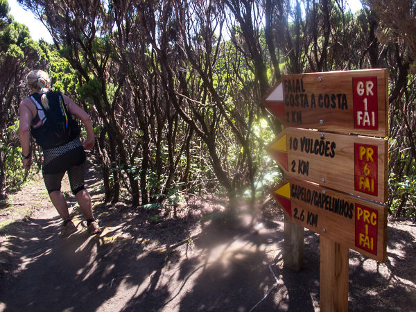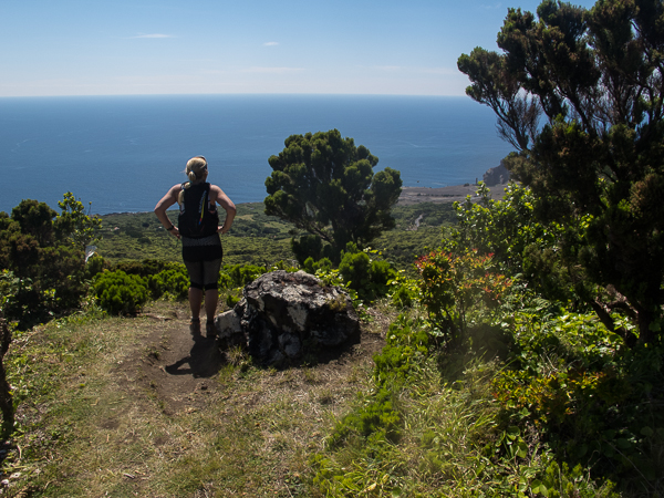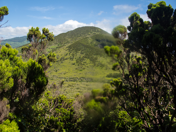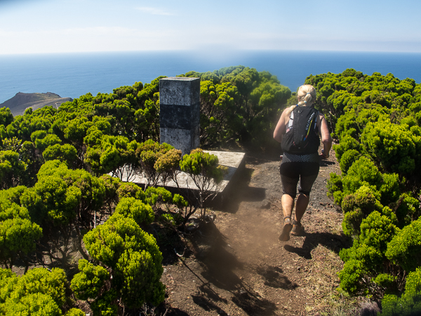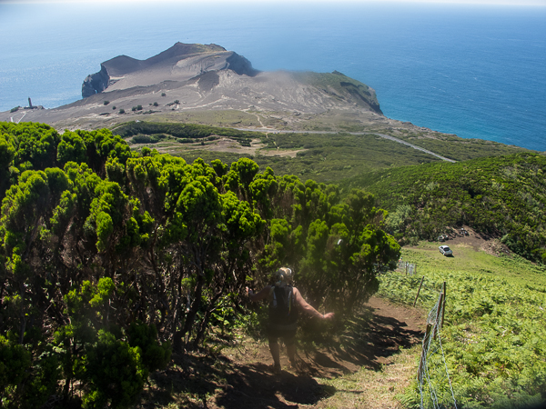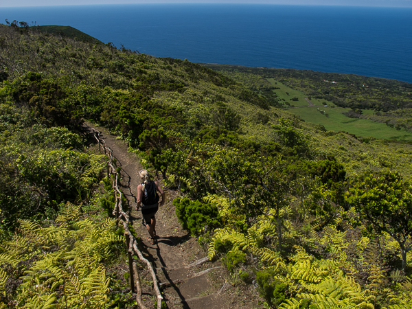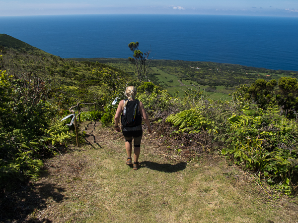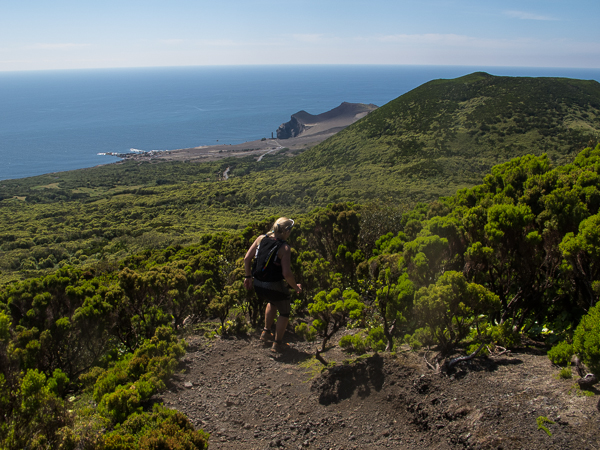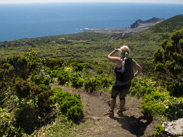 Sensationelles tut sich vor mir auf. Plötzlich ist neues Land in Sicht! Ich bleibe stehen, genieße den kilometerweiten Fernblick. Die Vulkankegel sehen von hier oben aus wie das Rückgrat eines grünen Dinos. Am Ende, sozusagen am Kopf des Drachens, ist der Ponta dos Capelinhos, die Halbinsel mit der bizarren Küstenlinie, zu sehen.