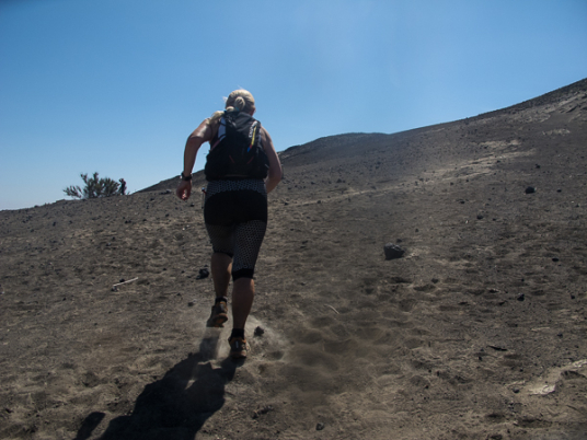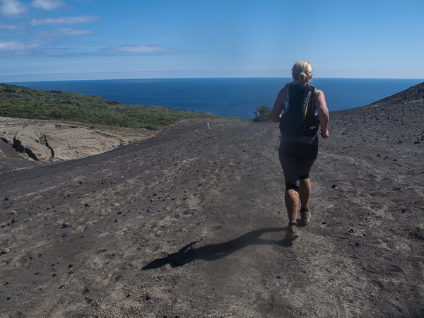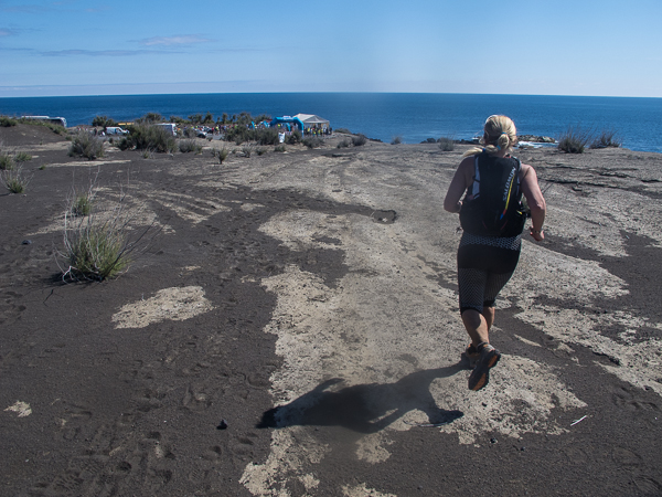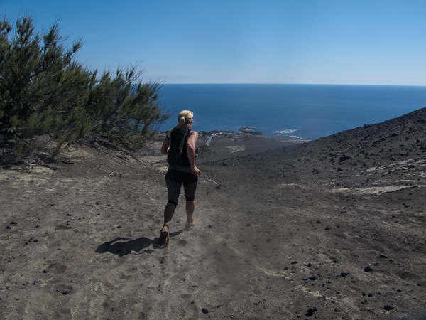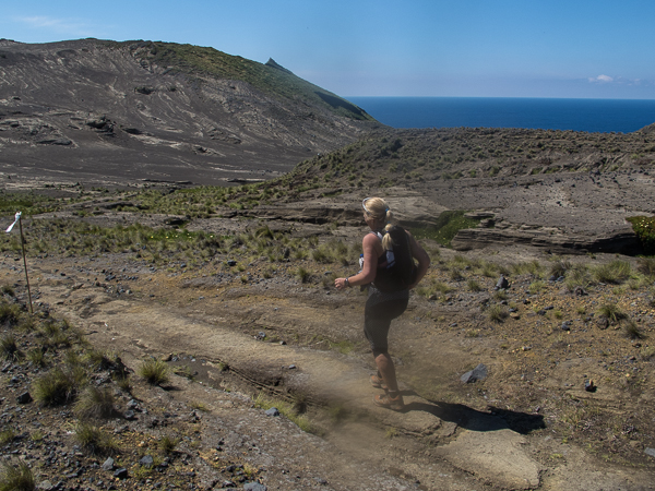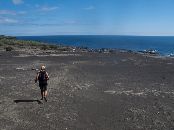 Dann geht alles viel zu schnell. Die Landschaft, einst unheimliches Naturspektakel, wird zum Landschaftsfilm – ich wünsche ihn mir in slow-motion. Das Gestein unter meinen Füssen gleicht einer Wüste aus Schlacke und Schotter. Kurz darauf ist es nur noch eine einfarbige Kulisse im müden Licht des Nachmittags, die sich sanft geneigt zur Küste zieht, die links und rechts mitgezogen wird – eine Mondlandschaft aus Asche und Staub. Ich stelle mir vor, wie vor nicht ganz so langer Zeit der Atlantik ein explosives Gebräu kochte, weiße Wolken aus Wasserdampf daraus empor schossen und das Meer zu brodeln begann.