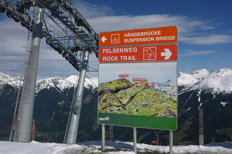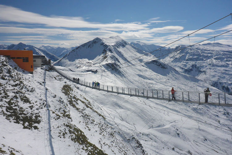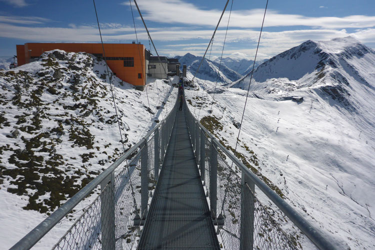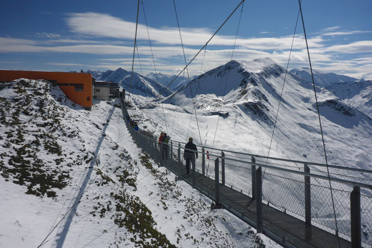 Bad Gastein selbst liegt inmitten des Nationalparks Hohe Tauern auf 1000 m Höhe. Bevor ich im Hotel einchecke, steuere ich die Stubnerkogelbahn an. Wenn wir schon im Rennen nicht drüber laufen können, will ich wenigstens einmal die Hängebrücke und den Felsentrail begehen und sichere mir somit praktisch ein paar entgangene Meter und natürlich auch ein Highlight des Kurses. Bequem geht es mit der modernen Gondelbahn in ein paar Minuten nach oben. Die Hängebrücke liegt direkt neben der Bergstation. 140 m ist sie lang und führt über einen ca. 30 m tiefen Abgrund. Auf fast 2300 m gelegen ist sie die erste Hängebrücke, welche auf solcher Höhe errichtet wurde. Laufen ist nicht empfehlenswert und wäre während des Rennens sicherlich auch nicht erlaubt, mit ein paar Leuten auf der Brücke schwankt es schon etwas. Für weniger Wagemutige gibt es parallel zur Hängebrücke einen Fußweg.