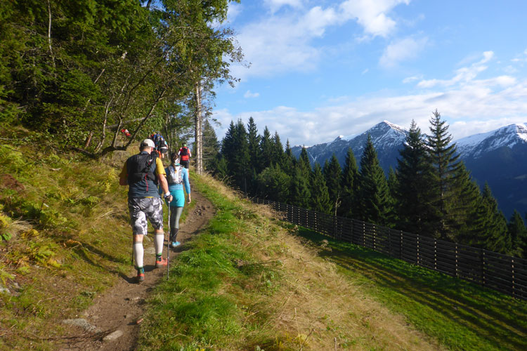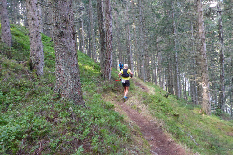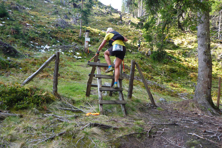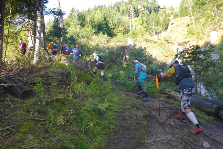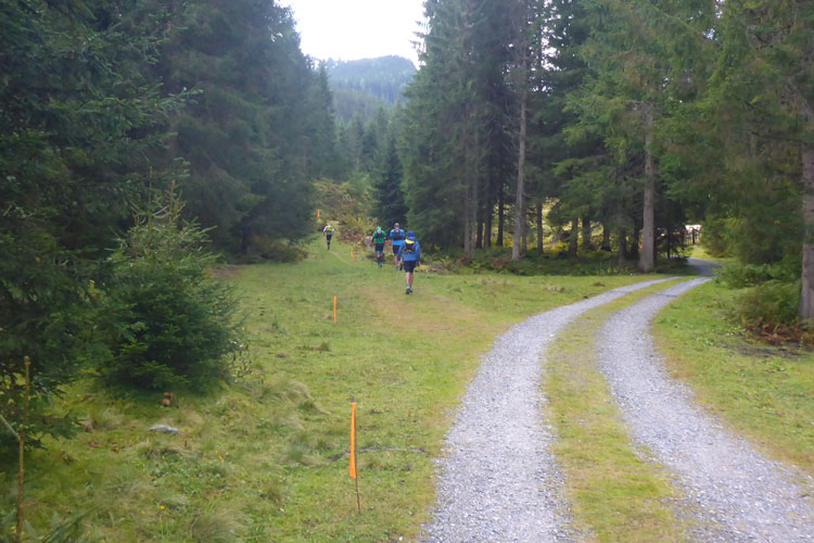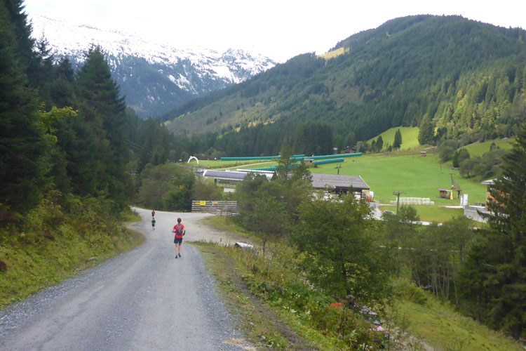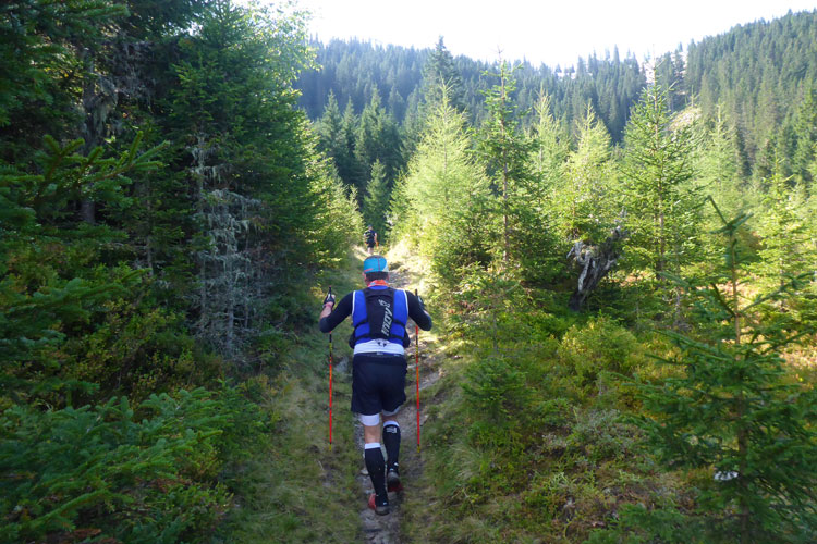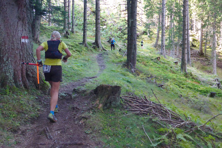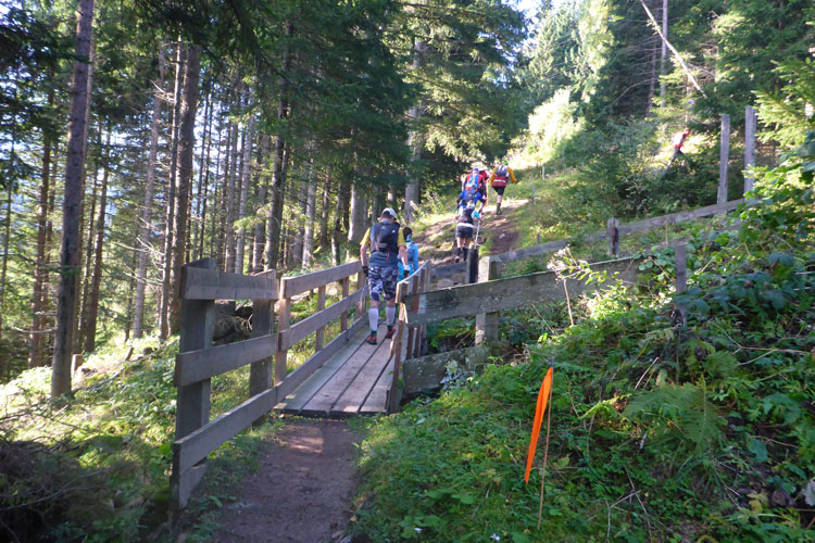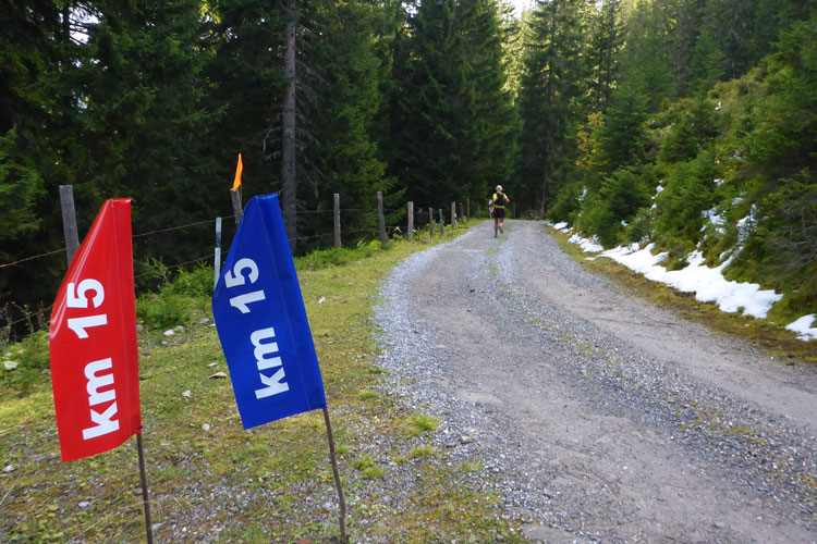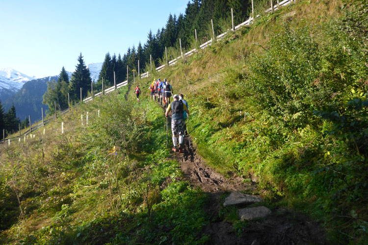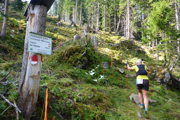 Etwa dreieinhalb Kilometer und 800 Höhenmeter insgesamt beträgt der erste Aufstieg. Diesen Abschnitt dürfen wir heute zweimal erkraxeln. Nachdem wir unsere große Runde in Bad Gastein (km 31) komplettiert haben, dürfen wir ab Talstation Stubnerbahn nochmals hier rauf und anschließend den zehn Kilometer langen Schlussabschnitt der großen Runde wiederholen. Das ergibt dann zusammen knapp 45 km. Natürlich hat man dann auch die Option, es bei 31 km zu belassen. Mehr Möglichkeiten für einen vernünftigen Long haben sich dem Rennleiter nicht ergeben. Aber, sage ich jetzt mal vielleicht etwas voreilig am Rennanfang, das Teilstück ist herrlich trailig, das kann man auch zweimal machen.