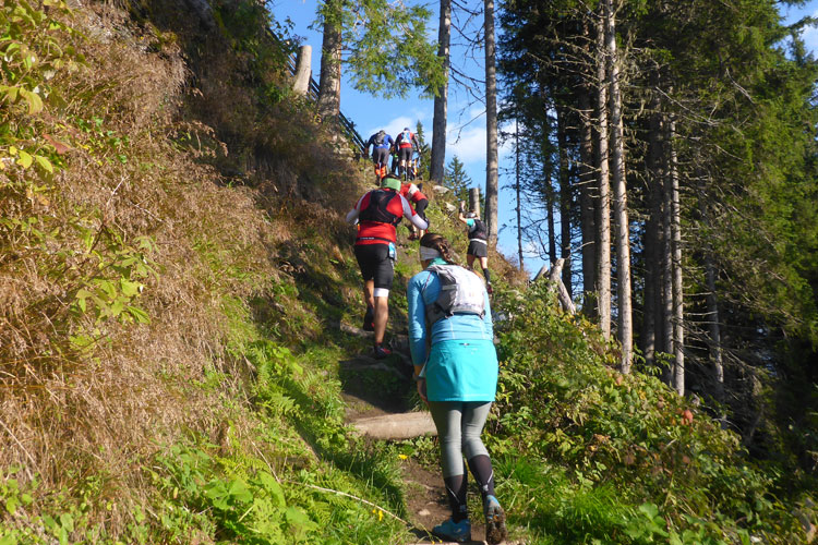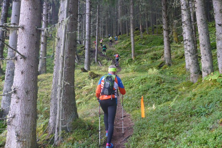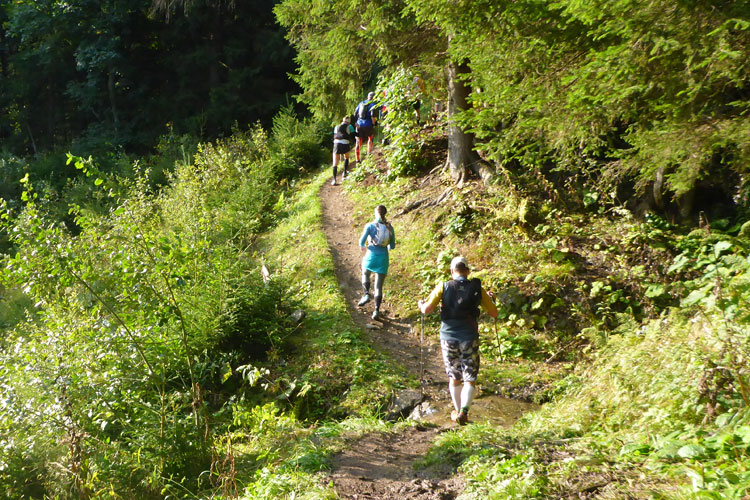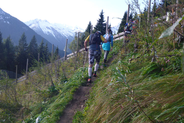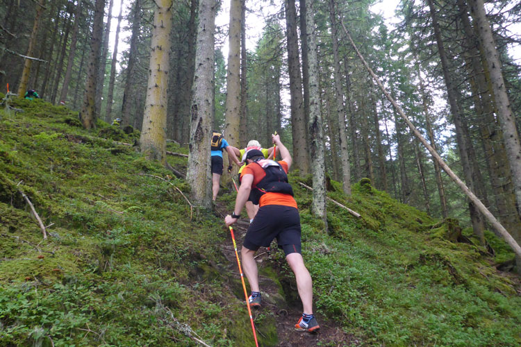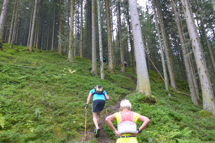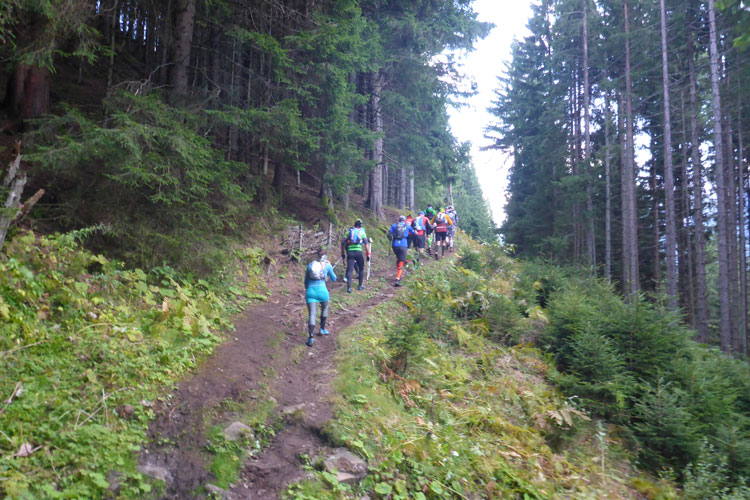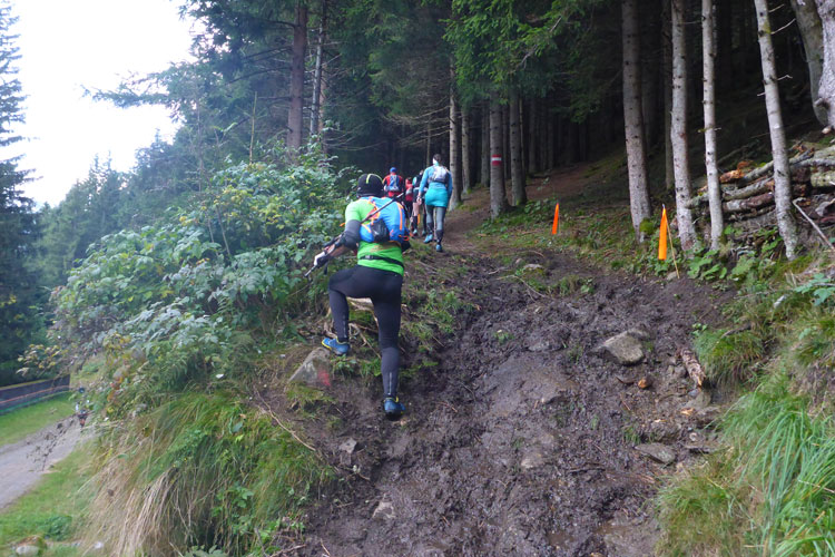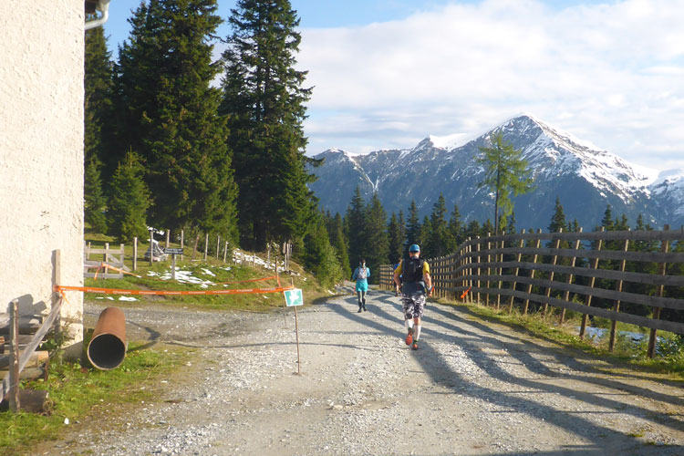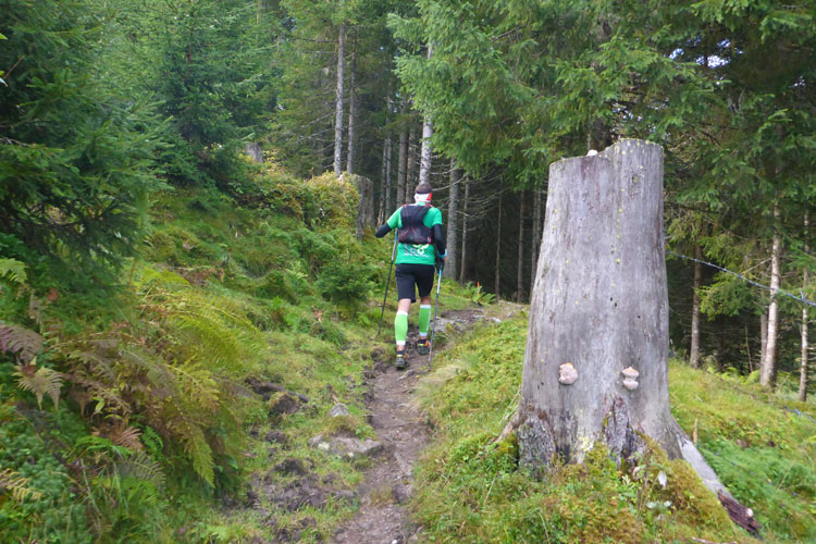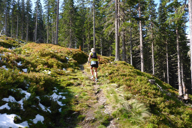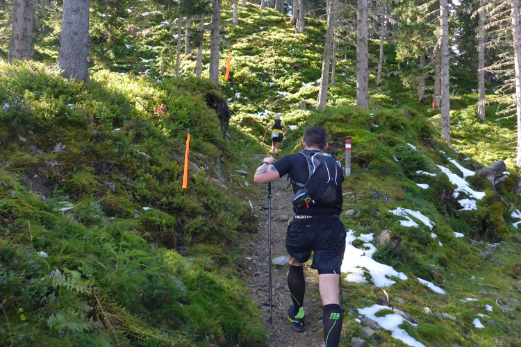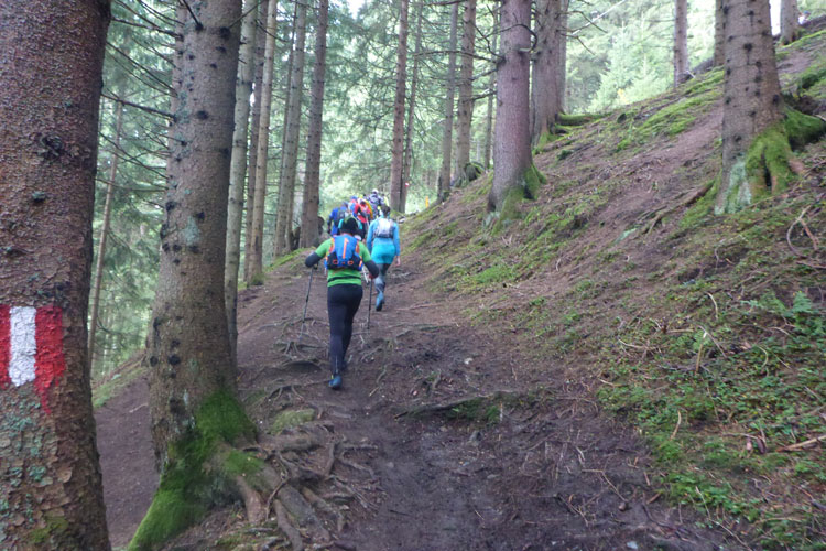 Etwa dreieinhalb Kilometer und 800 Höhenmeter insgesamt beträgt der erste Aufstieg. Diesen Abschnitt dürfen wir heute zweimal erkraxeln. Nachdem wir unsere große Runde in Bad Gastein (km 31) komplettiert haben, dürfen wir ab Talstation Stubnerbahn nochmals hier rauf und anschließend den zehn Kilometer langen Schlussabschnitt der großen Runde wiederholen. Das ergibt dann zusammen knapp 45 km. Natürlich hat man dann auch die Option, es bei 31 km zu belassen. Mehr Möglichkeiten für einen vernünftigen Long haben sich dem Rennleiter nicht ergeben. Aber, sage ich jetzt mal vielleicht etwas voreilig am Rennanfang, das Teilstück ist herrlich trailig, das kann man auch zweimal machen.