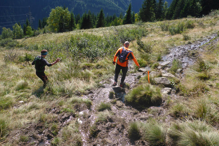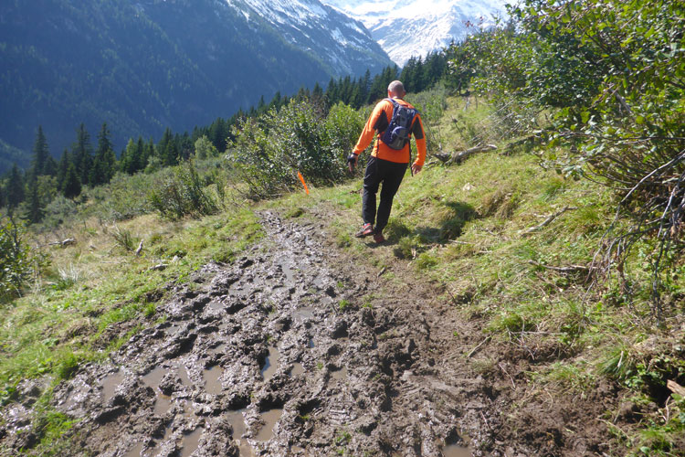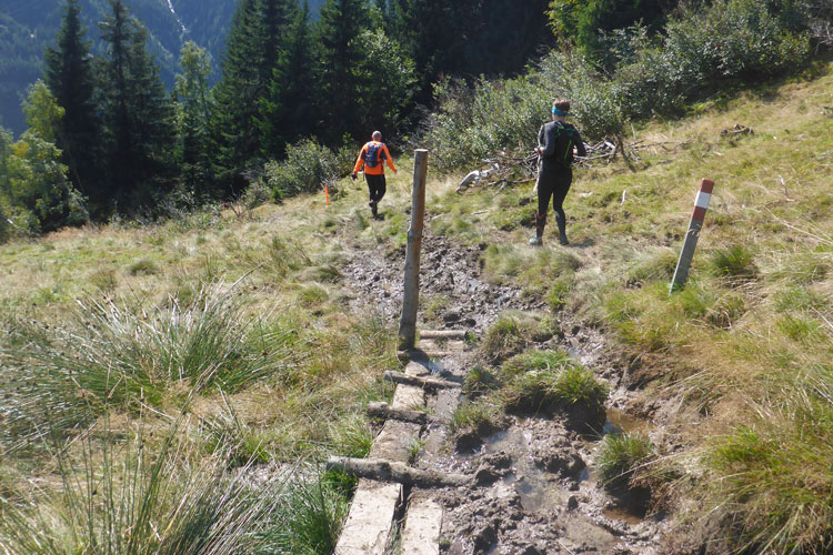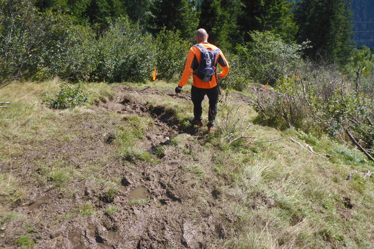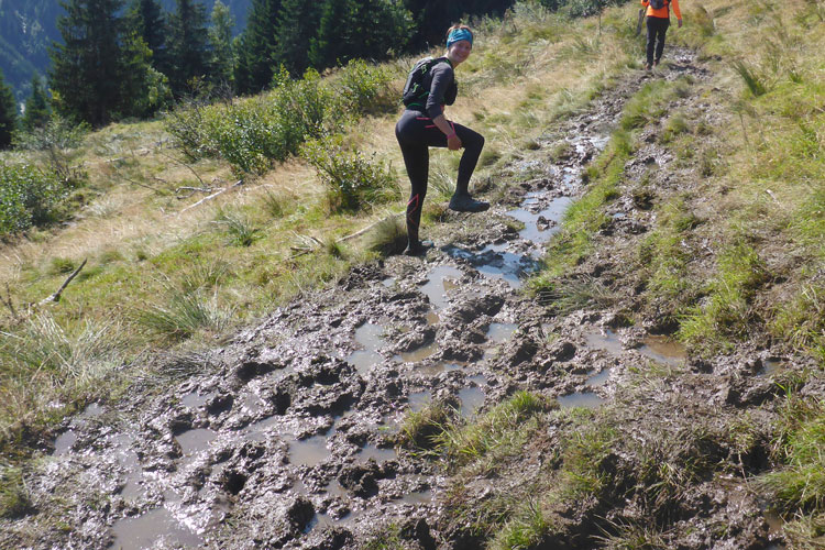 Erstmal geht es aber noch auf einer Schotterstraße etwa zwei Kilometer und 100 Höhenmeter nach oben, wo auf knapp 1900 m an der Oberen Zittauer Alm der höchste Punkt des Kurses erreicht wird. Dann wird’s spaßig. Der etwa 3,5 km lange und sehr steile Abstieg nach Altböckstein entwickelt sich zu einer äußerst selektiven Schlammschlacht und ist mit Sicherheit heute der schwierigste Teil der Strecke. Wahrscheinlich sind hier nur wenige runtergekommen, ohne nicht wenigstens einmal in die Suhle eingetaucht zu sein.