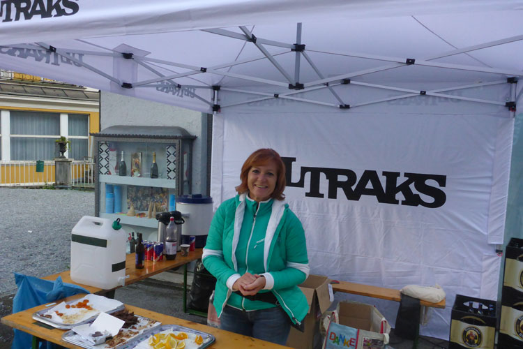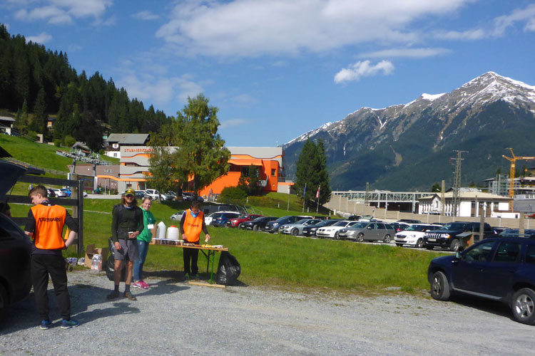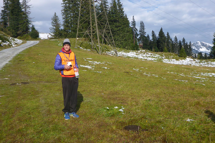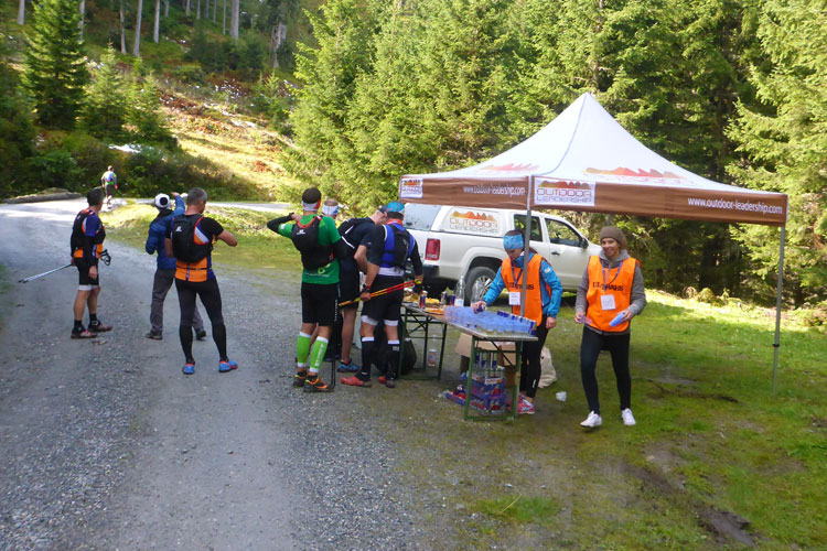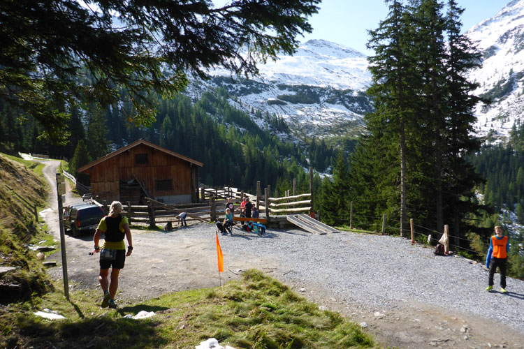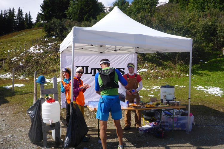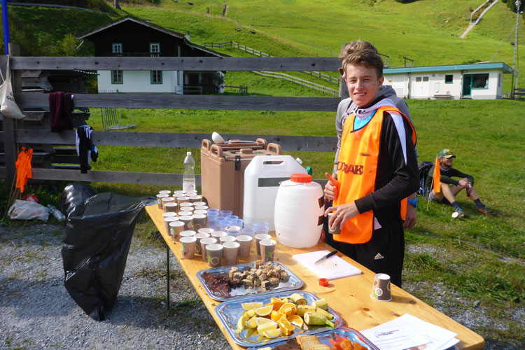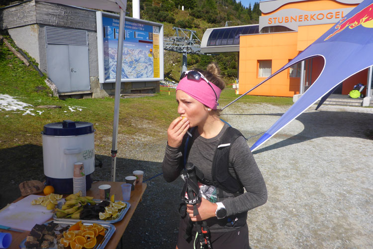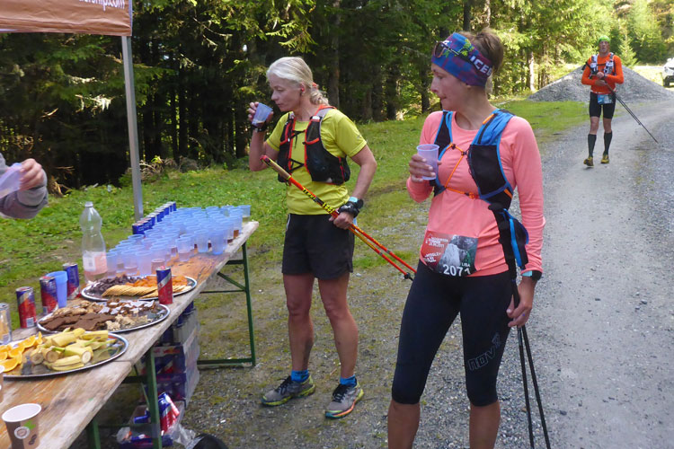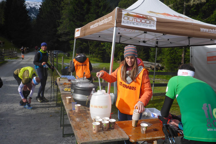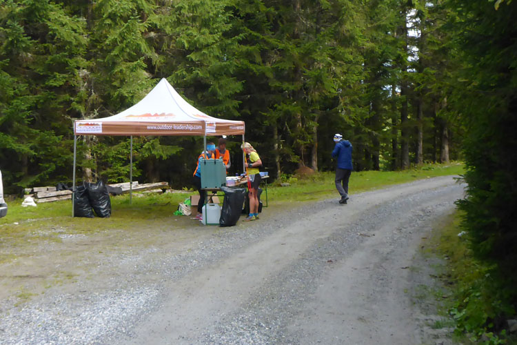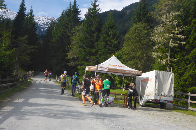 Unsere erste Verpflegungsstation erreichen wir im Angertal (km 11). Von 1800 sind wir wieder auf 1200 Meter heruntergelaufen. Das Getränkeangebot ist recht reichhaltig: es gibt Wasser, Iso, warmen Tee und – wir sind schließlich in Österreich – Red Bull pur oder Red Bull/Cola. Riegel, Kekse, Schokolade und Früchte werden ebenfalls angeboten.