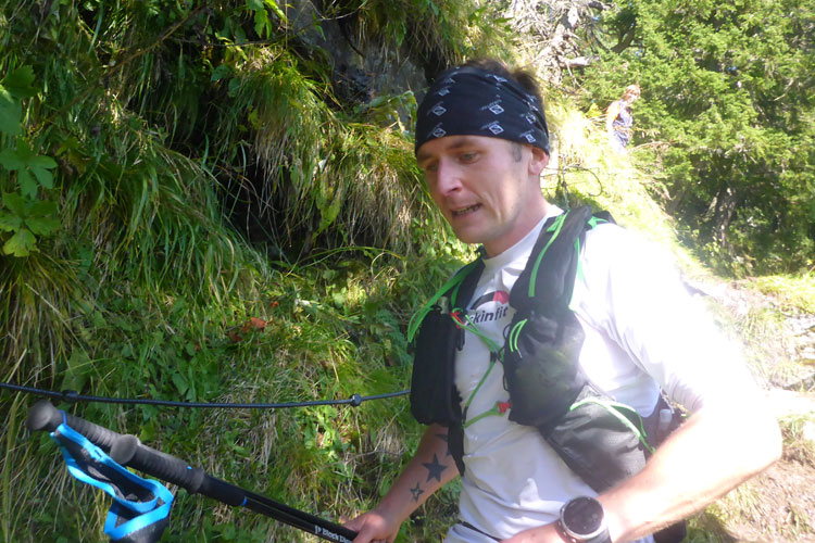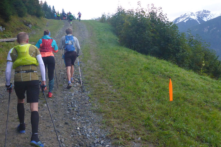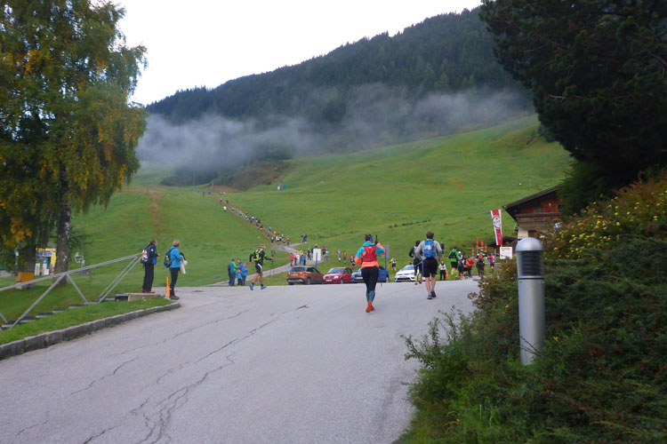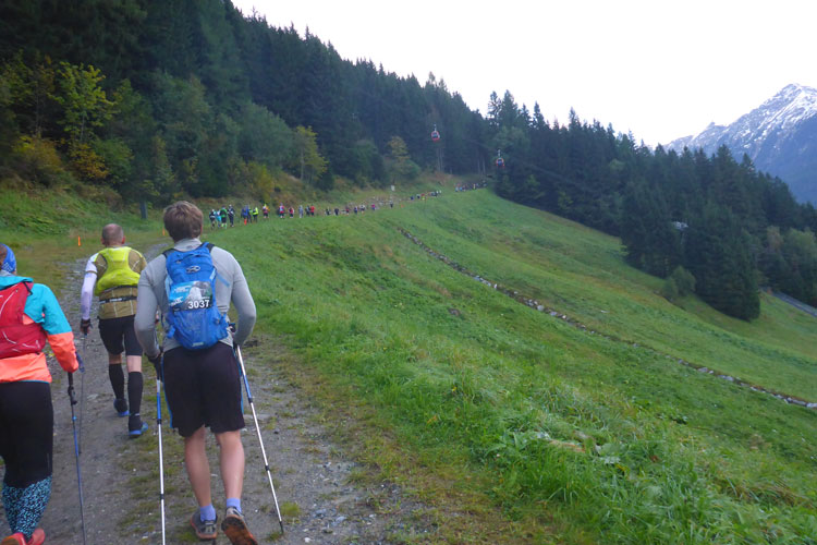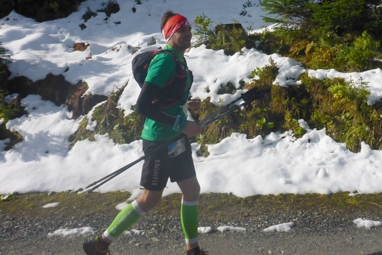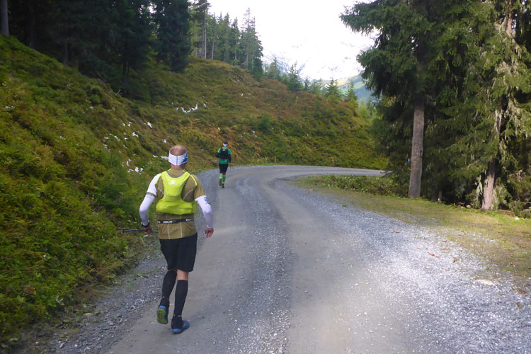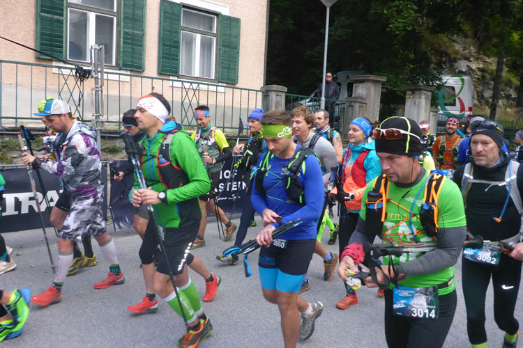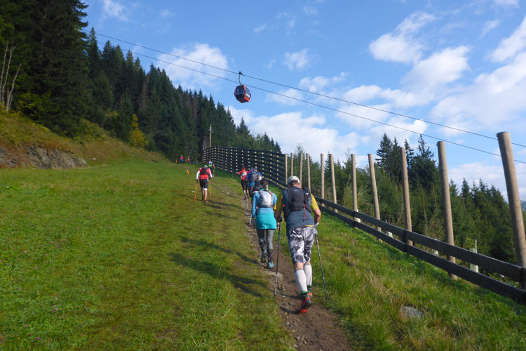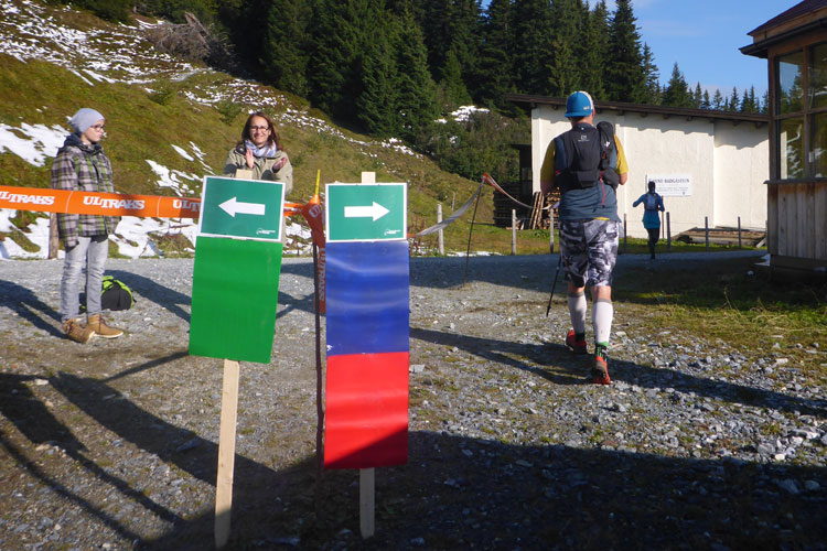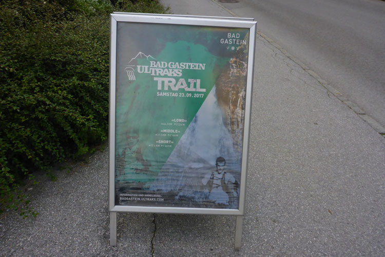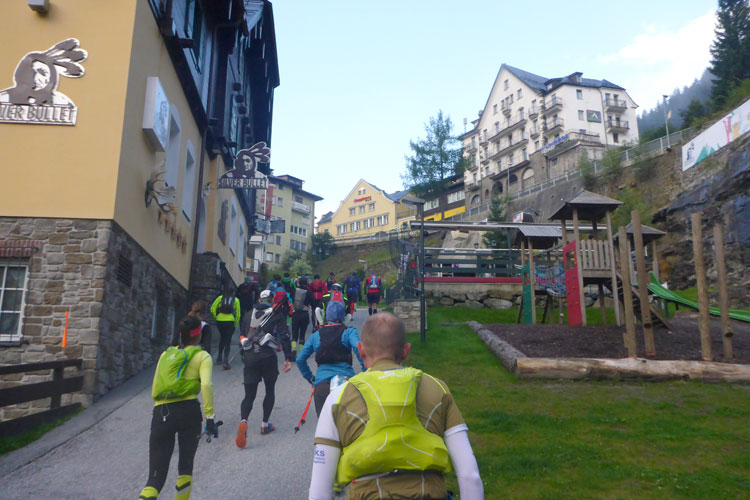 Verlockend ist die Aussicht, am Ortsrand von Bad Gastein nach rechts ins Ziel abzubiegen. Mein Schweinehund hätte eigentlich genug vom Gassi gehen und zieht ordentlich nach rechts. Mein Fotojob ist auch so gut wie erledigt, das wäre sehr einfach. Aber nix da, nach meinem Einbruch beim Maddalene Skymarathon, kann ich das überhaupt nicht durchgehen lassen. Zudem bin ich eine Stunde vor dem Cut-Off und kann es gelassen angehen. An der Labe vor der Stubnerbahn (km 31) liegt das Zeitlimit bei 6:45 Stunden. Ich packe meine Kamera ein und dafür die Stöcke aus und auffi geht’s zur zweiten Runde.