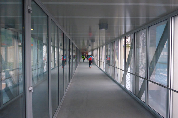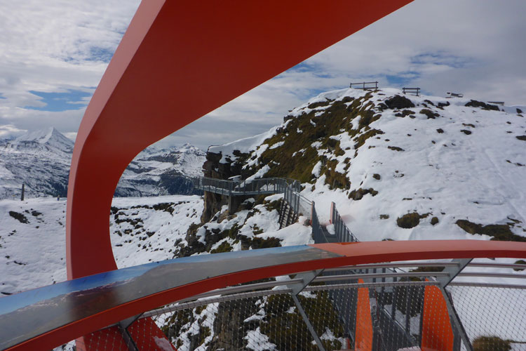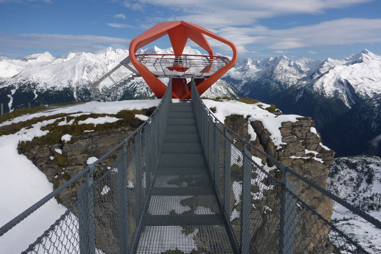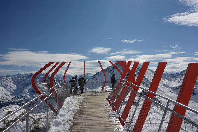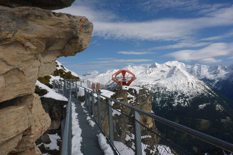 Der Felsenweg ist etwa 100 m lang und mit einem Gitterrostboden an den Fels gehängt. Auf den letzten 16 Metern geht es über eine Hängebrücke, die auf ein Plateau führt, welches Ähnlichkeit mit der Konstruktion des Glocknerblick mit ihren orangefarbenen Elementen hat. Wirkt sehr stabil, da kann man bestimmt auch im langsamen Laufschritt drüber. Mir gefallen die Attraktionen mit ihren herrlichen Ausblicken, ich hoffe doch sehr, dass sie nächstes Jahr den Läufern nicht vorenthalten bleiben.