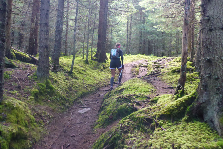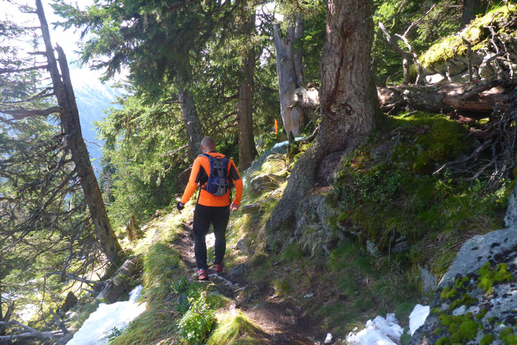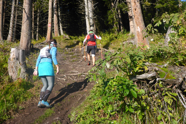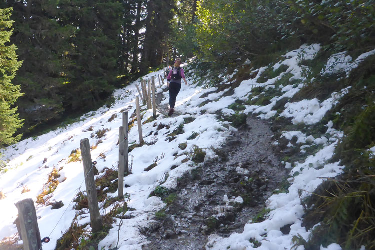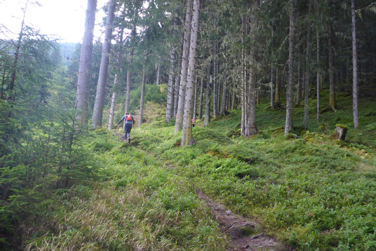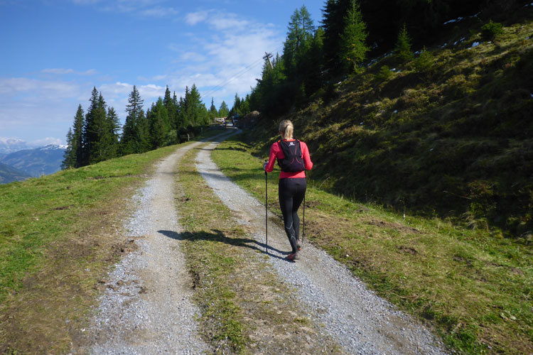 Recht kommod auf Wanderwegen und über die Talabfahrt der Stubnerbahn geht es los. Nach einem Kilometer verlassen wir die Skipiste und schlagen uns in den Wald. Auf wunderbaren schmalen Single-Trails geht es schön steil nach oben.