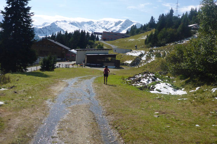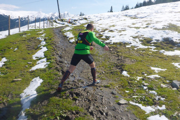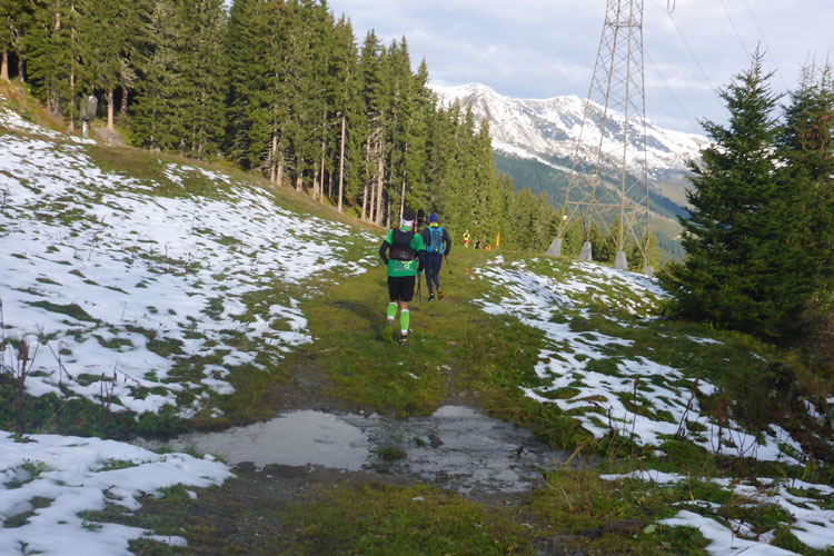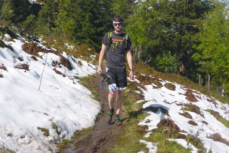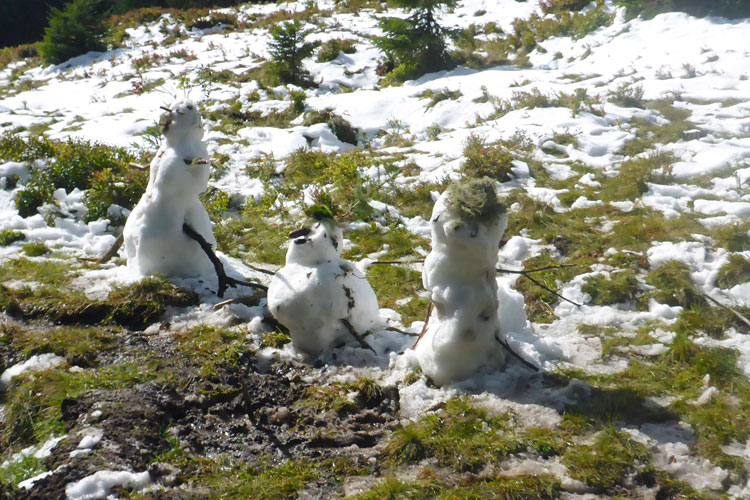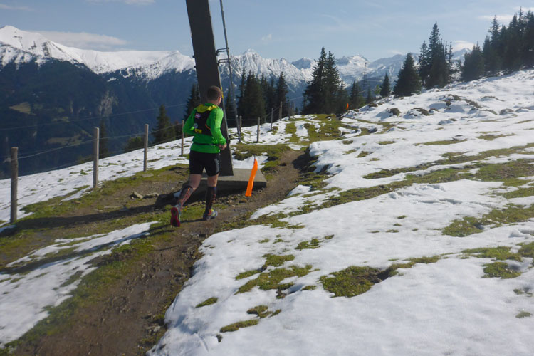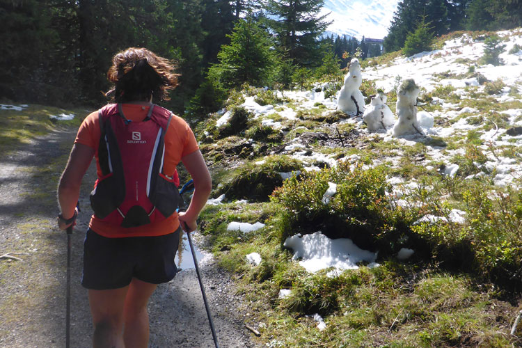 Die ausgetrampelten Trails sind mittlerweile schneefrei, dafür aber aufgeweicht und ganz schön schlammig. Drei bereits wieder schmelzende Schneemänner lassen erahnen, wie es hier ein paar Stunden zuvor ausgesehen haben mag. Wellig, aber immer auf etwa gleichbleibender Höhe ziehen wir um den Gipfel herum bis zurück an die Mittelstation der Stubnerbahn (km 21). Kurz danach können wir uns wieder verpflegen.