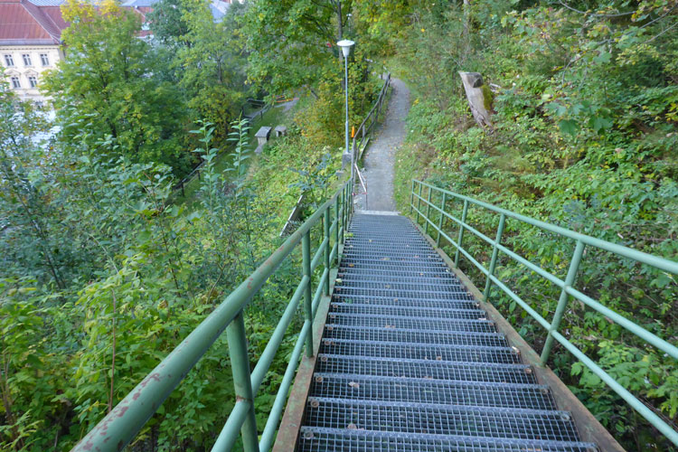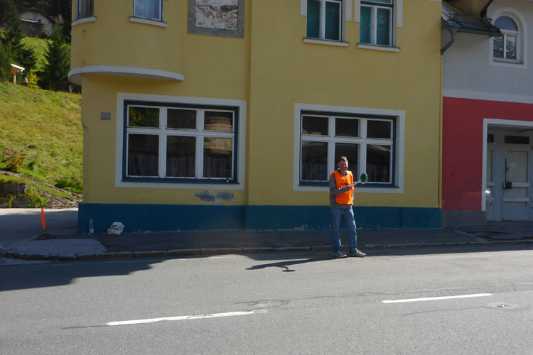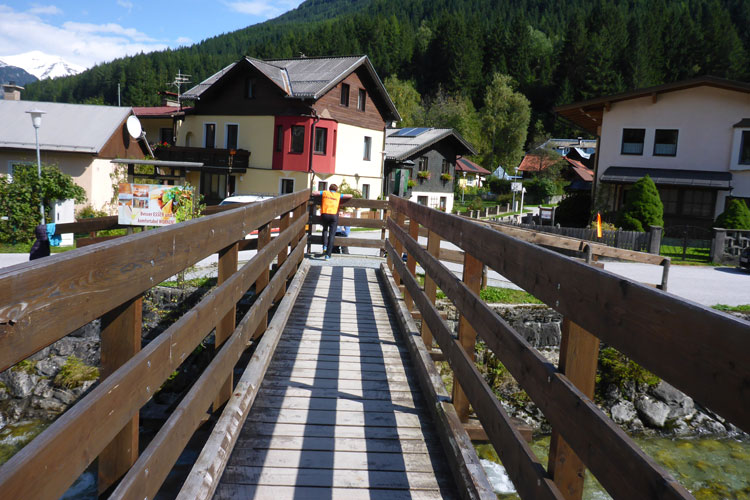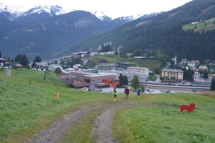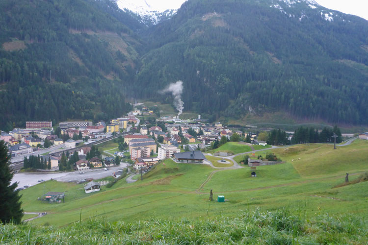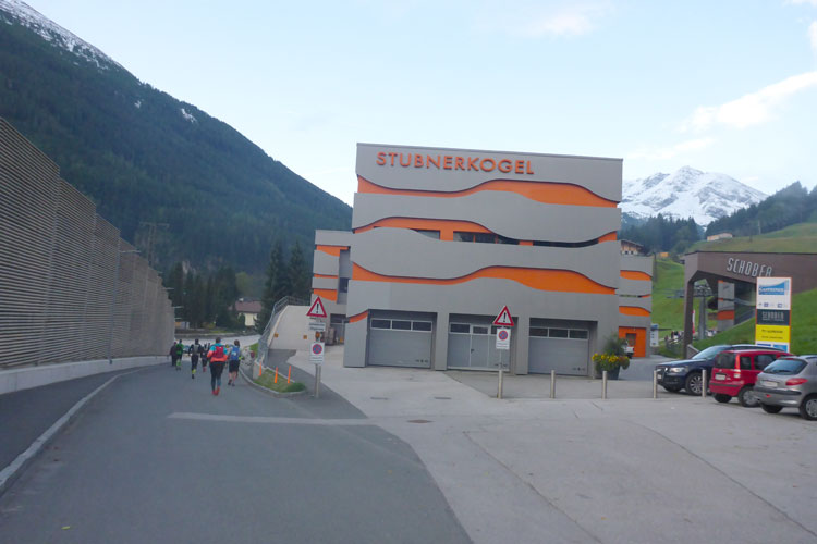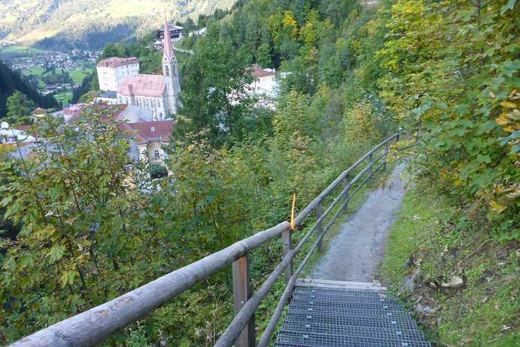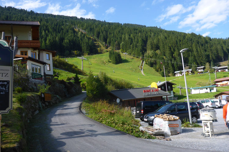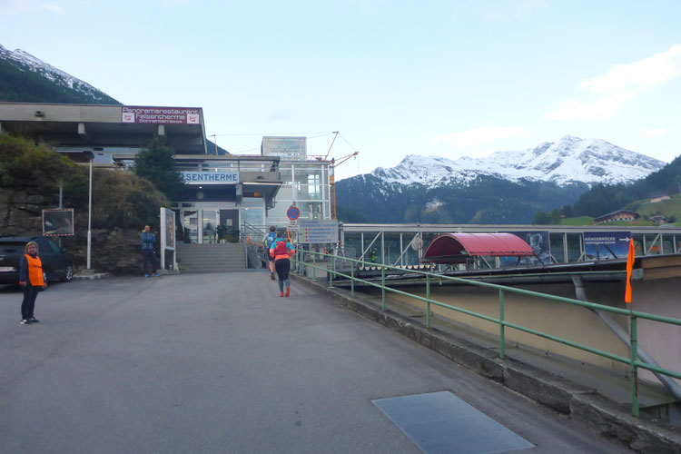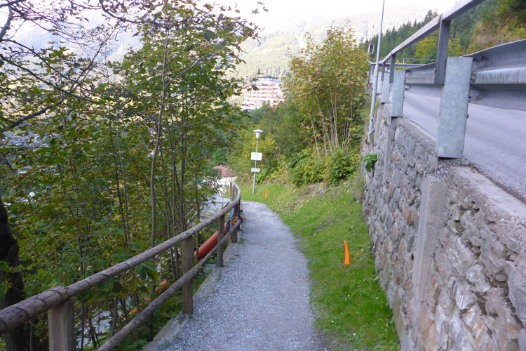 30 Meter führen leicht bergab, anschließend wird’s ernst. Durch enge Gassen geht es ansatzlos steil bergauf. Unsereins kann das nicht laufen, also erst mal Powerwalking. Auf Höhe der Talstation der Stubnerbahn nochmal eine kurze Flachpassage. Ein überdachter Übergang an der Felsentherme führt uns sicher über die Straße und nach 700 Metern an den Berg. Jetzt kennen wir auch den kürzesten Fußweg zu den Duschen.