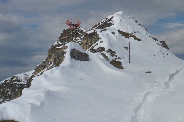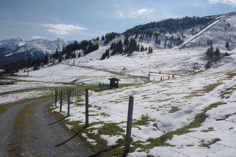 Die Sonne strahlt etwas oberhalb der Talstation bereits ziemlich kräftig, einige entledigen sich schon ihrer Jacken. Es ist temperaturmäßig jetzt wirklich sehr angenehm. Immer wieder verlassen wir kurz den Wald und kreuzen die Lifttrasse und die Almabfahrt. Etwas rechts der Mittelstation an der Ahornhütte sind wir oben.