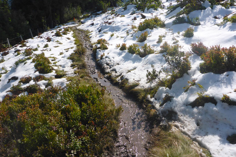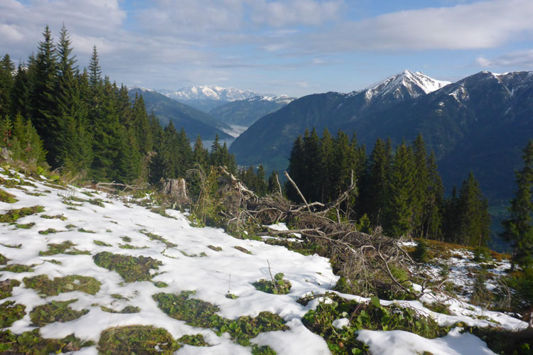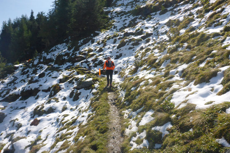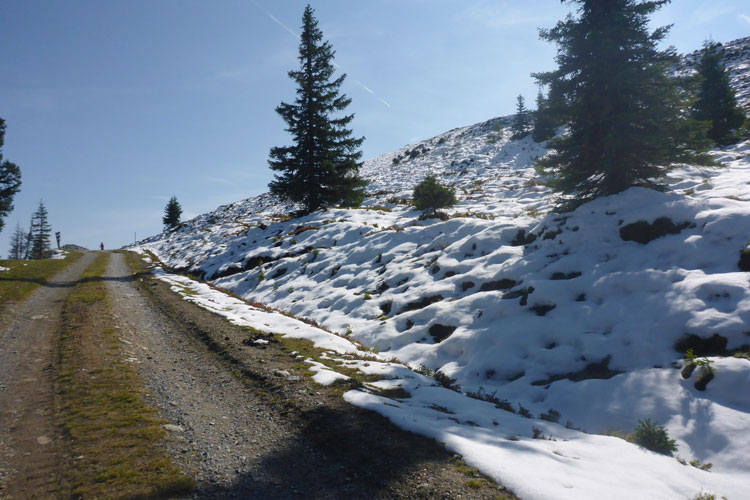 Für die nachfolgenden 3 km müssen wir uns mit einem längeren Forststraßenabschnitt begnügen. Es geht wieder hinauf auf den Stubnerkogel. Etwa auf 1800 m Höhe beginnt die Schneegrenze, wo für uns auch der komfortable Weg an der Stubneralm (km 19) endet. Automatisch folge ich noch einem abgetauten Pfad und übersehe im Schnee die Fähnchen die etwas nach oben führen.