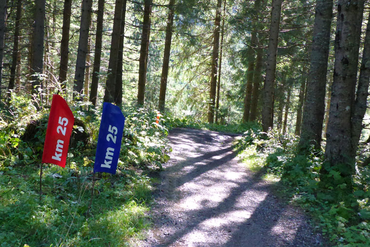 Nach einem kurzen Anlaufstück warten wieder herrliche Single-Trails auf uns, durch hohen Baumbestand geht es wieder nach oben. Nach zwei Kilometern erreichen wir eine Schnittstelle, die auch ein ganz kurzes Begegnungsstück beinhaltet. Nach einer etwa 2,5 km langen Schleife über die Schattbachalm kommen wir wieder hierher zurück. Man hat hier eine kleine Labestelle errichtet, an der wir uns so zweimal bedienen können.