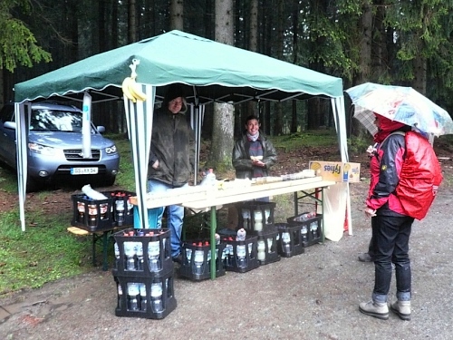 11 Kilometer sind geschafft, als wir auf ein einsames Dixi-Klo am Waldrand treffen. Kurz danach kommt die Versorgungsstation. Wäre umgekehrt nicht besser? Die jungen Leute sind sehr freundlich, obwohl sie ganz schön frieren. Und dann auch noch der Regen. Wir wollen gerade den Stand verlassen da kommt von hinten Powerschnecke, Lahmsogge oder Schneggi - Prof. Hans D. aus B.