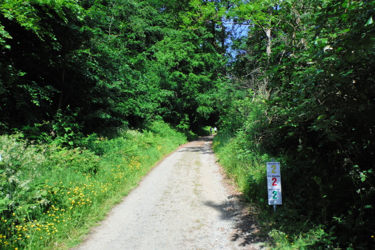Nach etwa 16,5 KM kommt die Verpflegungsstelle Abzweig. Frisch gestärkt folgen wir der Strecke nach rechts. Die meisten positiven Höhenmeter sind bewältigt. Die kommenden Kilometer zur Halbmarathonmarke geht es fasst kontinuierlich bergab. Je tiefer wir kommen, desto grüner und frischer wirkt der Wald. Die Forstwege weichen nach der Verpflegungsstation Grafenplatz einem schmalen Pfad durch dichten Wald. Rechts erkenne ich das Cafe Winuwuk mit seinem markanten Dach, dann tauche ich wieder in den Wald ein.