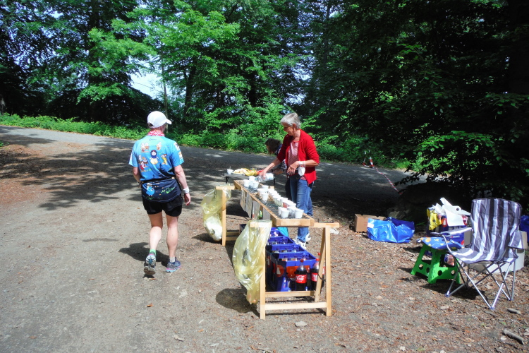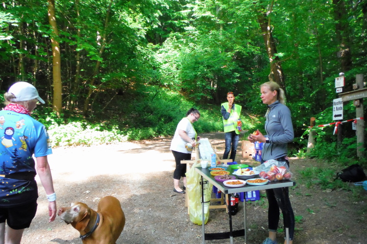 Unbeeindruckt folgen wir weiter dem eigenen Tempo. Ein Viertel des Marathons ist bewältigt. Es wartet der nächste VP. Gleiche Ausstattung mit Wasser, Cola, isotonischen Getränken, Salzbretzel, Obst, Salz und vielem mehr. Die beiden Damen sind besonders eifrig und tragen uns die Getränke schon entgegen. Sehr vorbildlich.