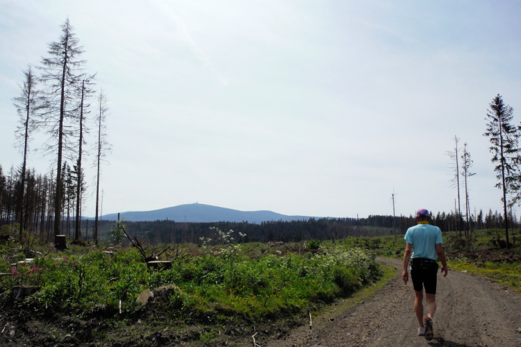 Der Wald ist hier der Dürre bereits zum Opfer gefallen. Trotz fehlendem Schatten schreite ich locker aus. Eine frische Brise kühlt das Gemüt. Immer wieder wachsen Felsen aus dem Boden. Dieser Ausblick war vor Jahren noch nicht zu genießen. Es folgt bereits der nächste VP, von dem war im Streckenplan nichts zu sehen. Sinnvoll ist er beim heutigen Wetter trotzdem. Die folgende Steigung wird gehend bewältigt. Geradeaus kommt der Brocken in den Blick. Ulrich kann den Vergleich zu den Vorjahren ziehen. So frei wie heute war die Aussicht lange nicht. Früher konnte man den nördlichsten 1.000er Deutschlands nur auf dem Teil der Strecke sehen, der direkt auf den Berg zuführte.