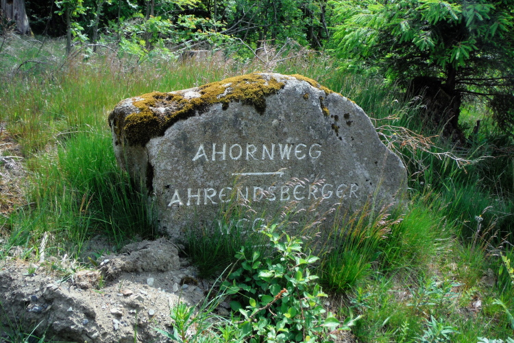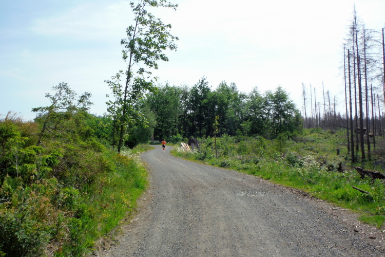 KM 15 ist passiert, ein Stein weist uns den Ahrendsberger Weg. Dieser führt aus dem Okertal zu den gleichnamigen Klippe. Erreichen werden wir diese heute nicht, dafür ist die höchste Erhebung nicht mehr weit. Leicht wellig ist das Streckenprofil auf den folgenden Kilometern auf einer Höhe von mehr als 600 Metern. Immer wieder wechseln sich Wald, dürre Recken und gerodete Flächen ab, rechts oder links ist dabei scheinbar egal.