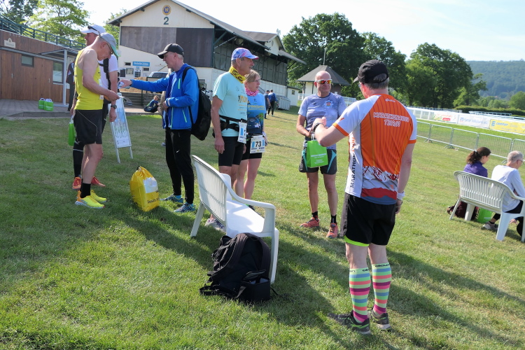 Dafür sind wir stressfrei um kurz vor 9.00 Uhr an der Startnummernausgabe. Nachmeldungen sind möglich und bei der bisherigen Teilnehmerzahl, beim Marathon etwas über 70, wünschenswert. Das sonnige Wetter kann leider nicht entscheidend dazu beitragen. Innerhalb kürzester Zeit halte ich meine Startnummer in den Händen und es bleibt Gelegenheit auf mir bekannte Gesichter zu warten, wie Gerd und Michaela. Im Schatten ist es noch frisch, die Sonne lässt allerdings erahnen, dass sich das bis zum Ende des Laufes noch drastisch ändern wird.